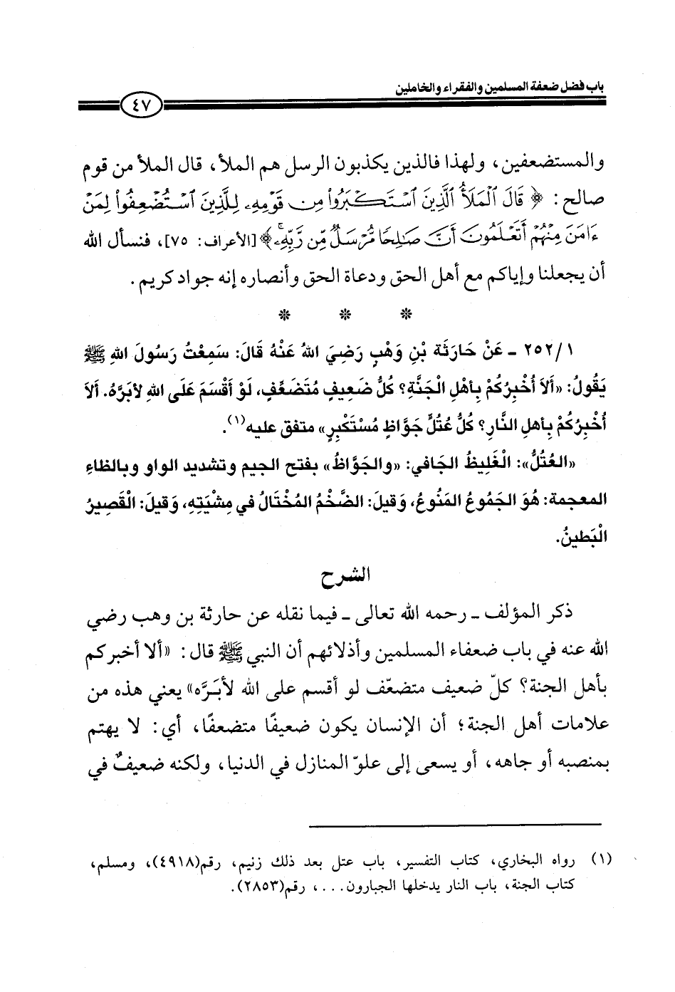 1/252 ـ عن حارثة بن وهب رضي الله عنه قال: سمعت رسول الله صلى الله عليه وسلم يقول ((ألا أخبركم يأهل الجنة؟ كل ضعيف متضعف، لو أقسم على الله لا بره. ألا أخبركم بأهل النار؟ كل عتلٍ جواظٍ مستكبر)) متفق عليه.