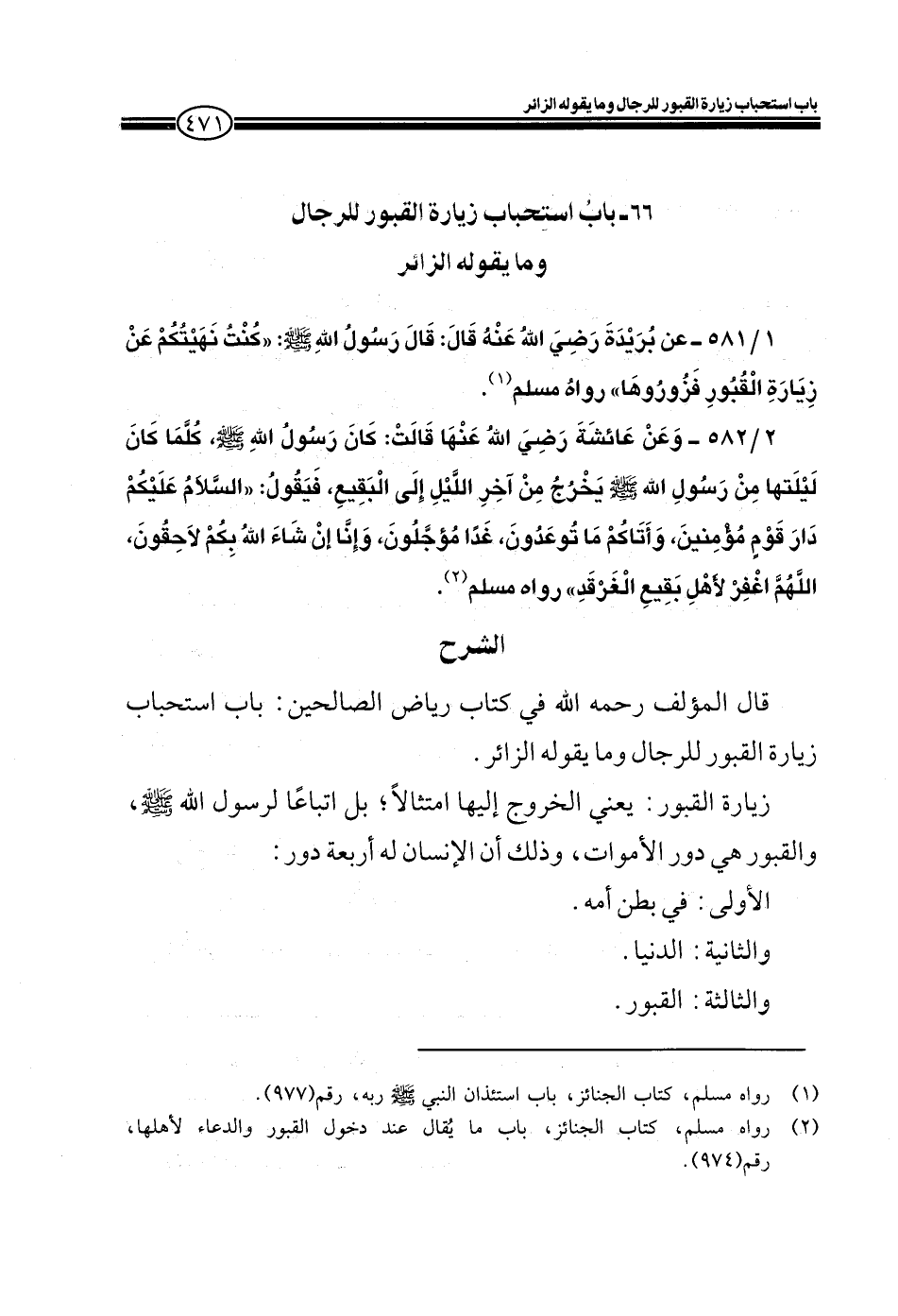 EXقال المؤلف رحمه الله في كتاب رياض الصالحين: باب استحباب زيارة القبور للرجال وما يقوله الزائر.