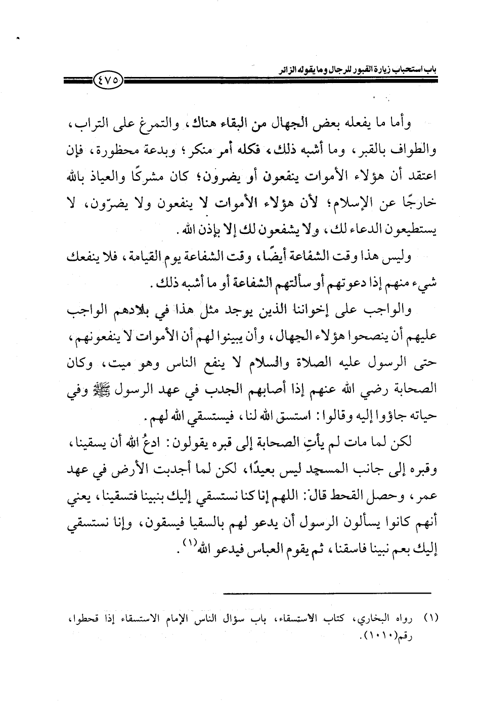 لكن لما مات لم يأتِ الصحابة إلى قبره يقولون: ادعُ الله أن يسقينا، وقبره إلى جانب المسجد ليس بعيداً، لكن لما أجدبت الأرض في عهد عمر، وحصل القحط قال: اللهم إنا كنا نستسقي إليك بنبينا فتسقينا، يعني أنهم كانوا يسألون الرسول أن يدعو له بالسقا فيسقون، وإنا نستسقي إليك بعم نبينا فاسقنا، ثم يقوم العباس فيدعو الله.