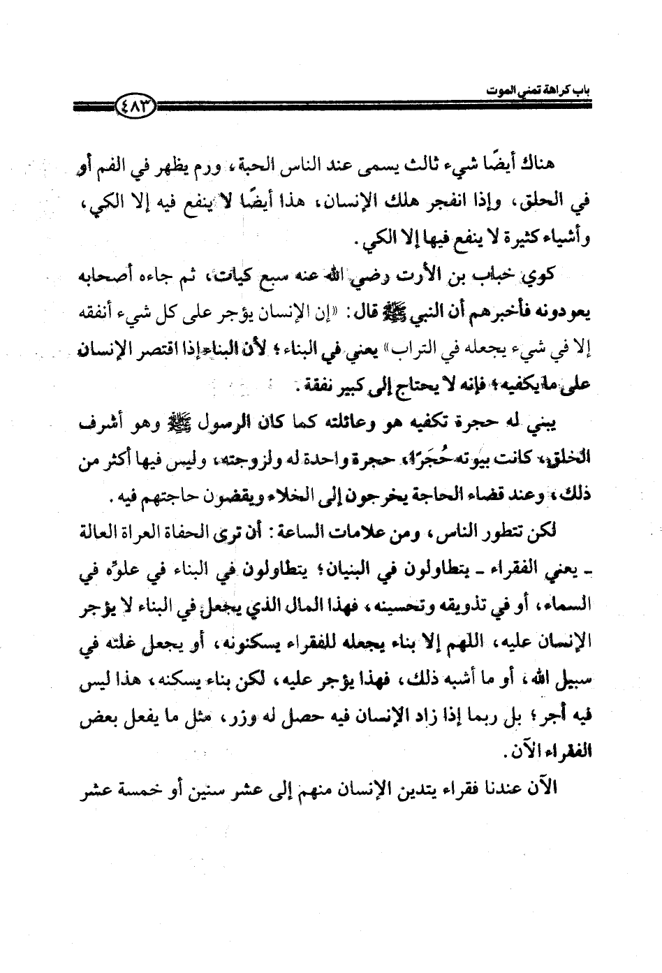 كوى خباب بن الأرت رضي الله عنه سبع كيات، ثم جاءه أصحابه يعودونه فأخبرهم أن النبي صلى الله عليه وسلم قال: ((إن الإنسان يؤجر على كل شيء أنفقه إلا في شيء يجعله في التراب)) يعني في البناء؛ لأن البناء إذا اقتصر الإنسان على ما يكفيه؛ فإنه لا يحتاج إلى كبير نفقة.