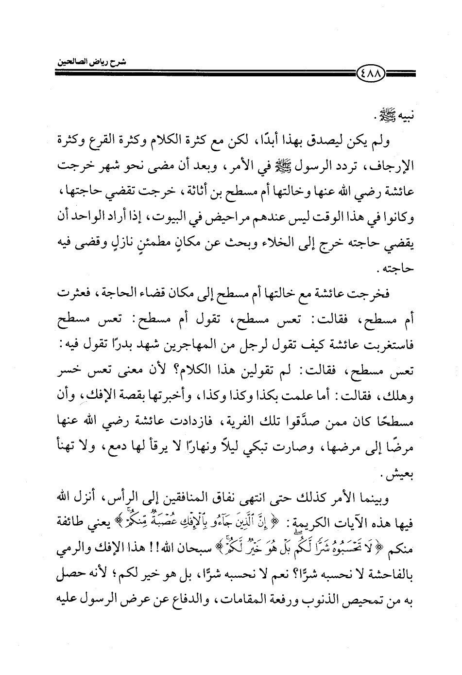 وبينما الأمر كذلك حتى انتهى نفاق المنافقين إلى الرأس، أنزل الله فيها هذه الآيات الكريمة: (إِنَّ الَّذِينَ جَاءُوا بِالْإفْكِ عُصْبَةٌ مِنْكُمْ) (النور: 11) يعني طائفة منكم (لا تَحْسَبُوهُ شَرّاً لَكُمْ بَلْ هُوَ خَيْرٌ لَكُمْ) سبحان الله!! هذا الإفك والرمي بالفاحشة لا نحسبه شراً؟ نعم لا نحسبه شراً، بل هو خير لكم؛ لأنه حصل به من تمحيص الذنوب ورفعة المقامات، والدفاع عن عرض الرسول عليه