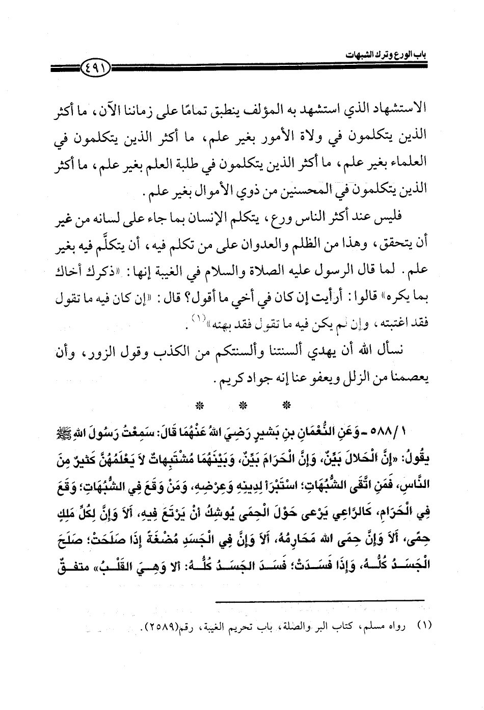 1/588- وعن النُعمان بن بشيرٍ رضي الله عنهما قالَ: سمعتُ رسول الله صلى الله عليه وسلم يقُولُ: ((إن الحلالَ بينٌ، وإن الحرام بينٌ، وبينهما مُشتبِهاتٌ لا يعلمهن كثيرٌ من الناسِ، فمن اتقى الشبُهاتِ؛ استبرا لدينه وعرضهِ، ومن وقع في الشبهاتِ؛ وقع في الحرام، كالراعي يرعى حول الحمى يُوشك أن يرتع فيه، ألا وإن لكلّ ملكٍ حمى، ألاَ وإنَّ حمى الله محارمهُ، الاَ وإن في الجسد مضغةً إذا صلحت؛ صلح الجسدُ كلهُ، وإذا فسدت: فسد الجسد كلهُ: ألا وهيَ القلبُ)) متفق