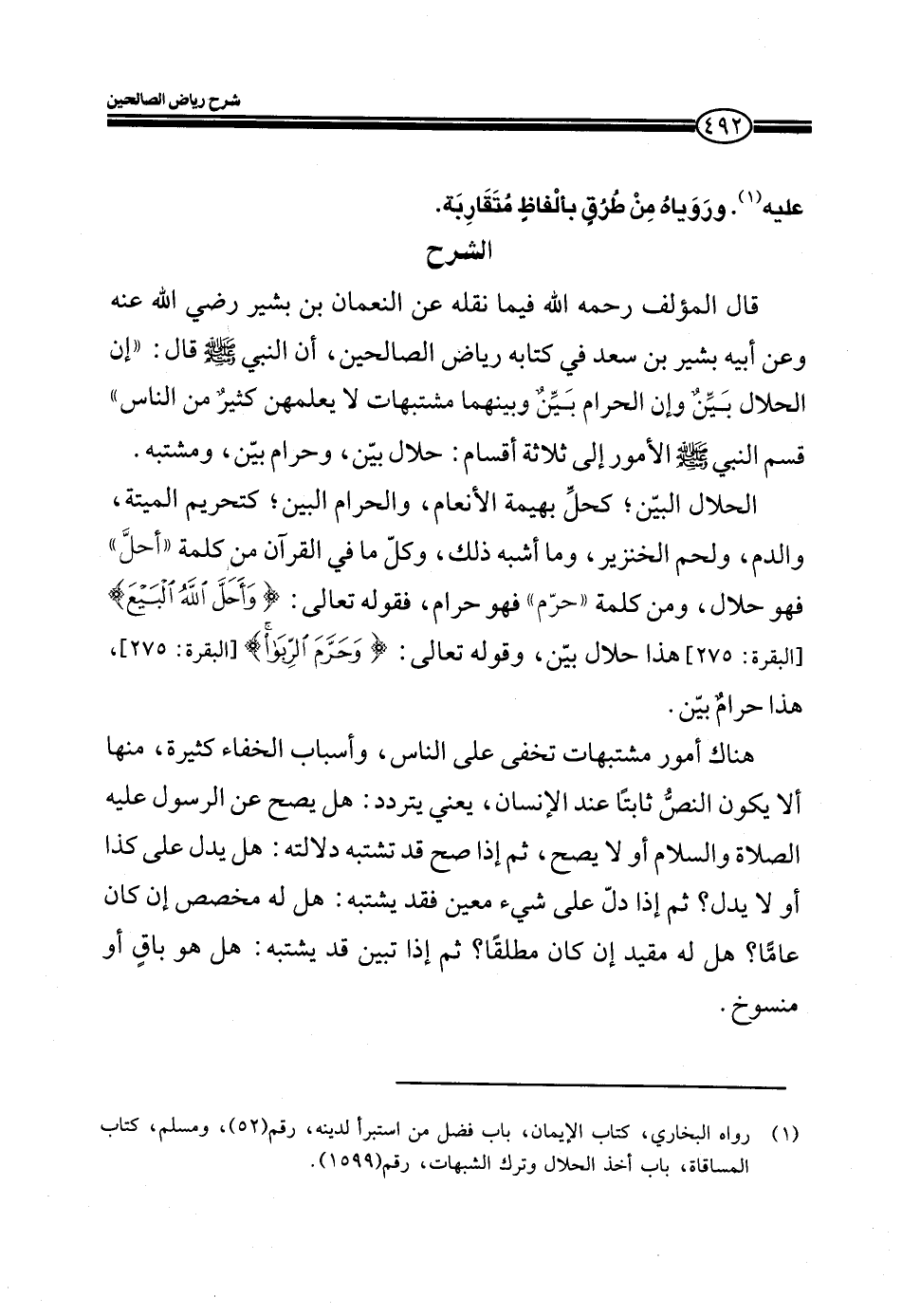 EXقال المؤلف رحمه الله فيما نقله عن النعمان بن بشير رضي الله عنه وعن أبيه بشير بن سعد في كتابه رياض الصالحين، أن النبي صلى الله عليه وسلم قال: ((إن الحلال بينٌ وإن الحرام بيّنٌ وبينهما متشبهات لا يعلمهن كثيرٌ من الناس)) قسم النبي صلى الله عليه وسلم الأمور إلى ثلاثة أقسام: حلال بيّن، ومشتبه.