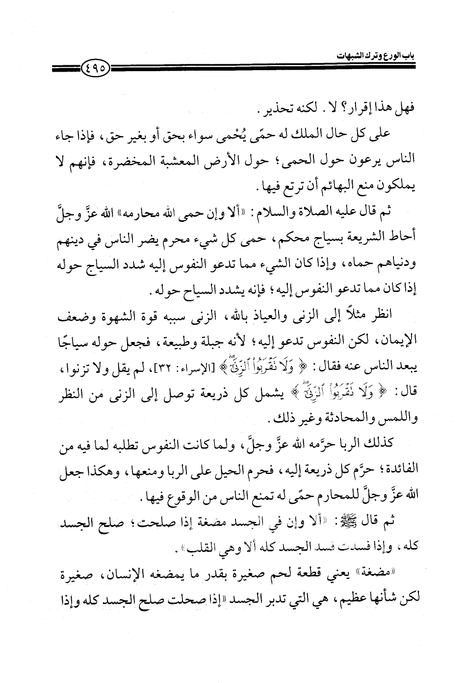 ثم قال عليه الصلاة والسلام: ((ألا وإن حمى الله محارمه)) الله عز وجلَّ أحاط الشريعة بسياج محكم، حمى كل شيء محرم يضر الناس في دينهم ودنياهم حماه، وإذا كان الشيء مما تدعو النفوس إليه شدد السياج حوله إذا كان مما تدعو النفوس إليه؛ فإنه يشدد السياح حوله.