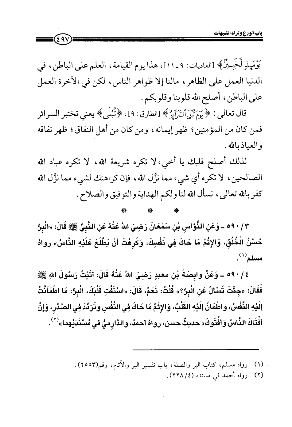 4/590- وعن وابصة بن معبدٍ رضي الله عنهُ قال: أتيتُ رسول الله صلى الله عليه وسلم فقالَ: "جئت تسألُ عن البر؟ " قُلتُ نعم، قال: ((استفت قلبك، البرُّ: ما اطمأنت إليه النفسُ، واطمأن إليه القلبُ، والإثم ما حاك في النفسِ وتردد في الصدر، وإن أفتاك الناسُ وأفتوكَ)) حديث حسن، رواهُ أحمدُ، والدارميُّ في مُسنديهما".