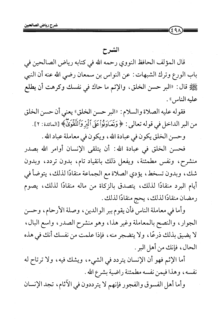 EXقال المؤلف الحافظ النووي رحمه الله في كتابه رياض الصالحين في باب الورع وترك الشبهات: عن النواس بن سمعان رضي الله عنه أن النبي صلى الله عليه وسلم قال: ((البر حسن الخلق، والإثم ما حاك في نفسك وكرهت أن يطلع عليه الناس)) .