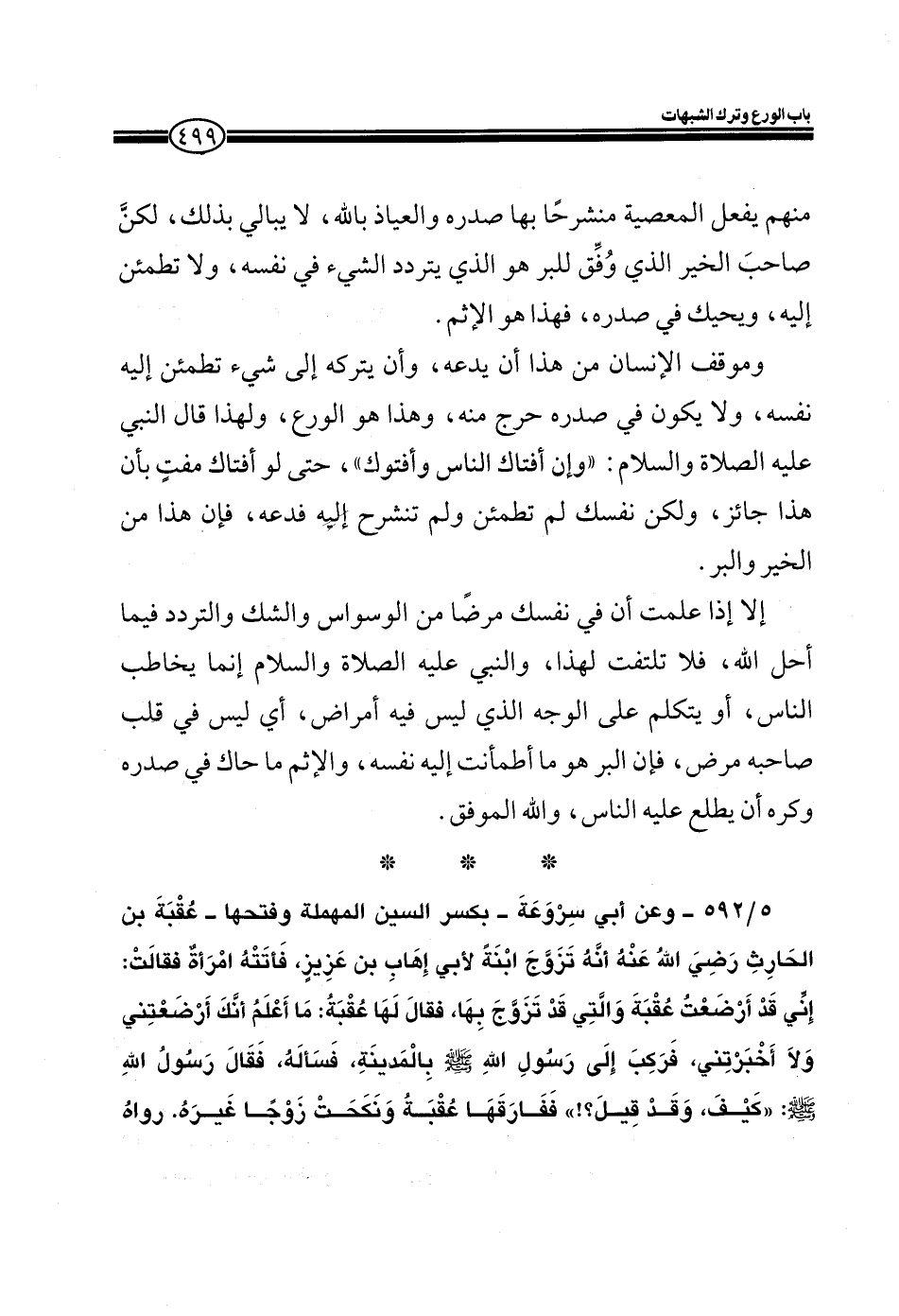 5/592- وعن ابي سروعةَ - بكسر السين المهملة وفتحها- عُقبةَ بن الحارثِ رضيَ الله عنهُ أنهُ تزوجَ ابنةً لأبي إهاب بن عزيز، فأتتهُ امرأةٌ فقالت: إني قد أرضعتُ عُقبة والتي قد تزوج بها، فقال لها عُقبةُ: ما أعلم أنك أرضعتني ولا أخبرتني، فركب إلى رسول الله صلى الله عليه وسلم بالمدينةِ، فسألهُ، فقالَ رسولُ الله صلى الله عليه وسلم: "كيفَ، وقد قيلَ؟! " ففارقها عقبةُ ونكحت زوجا غيرهُ. رواهُ