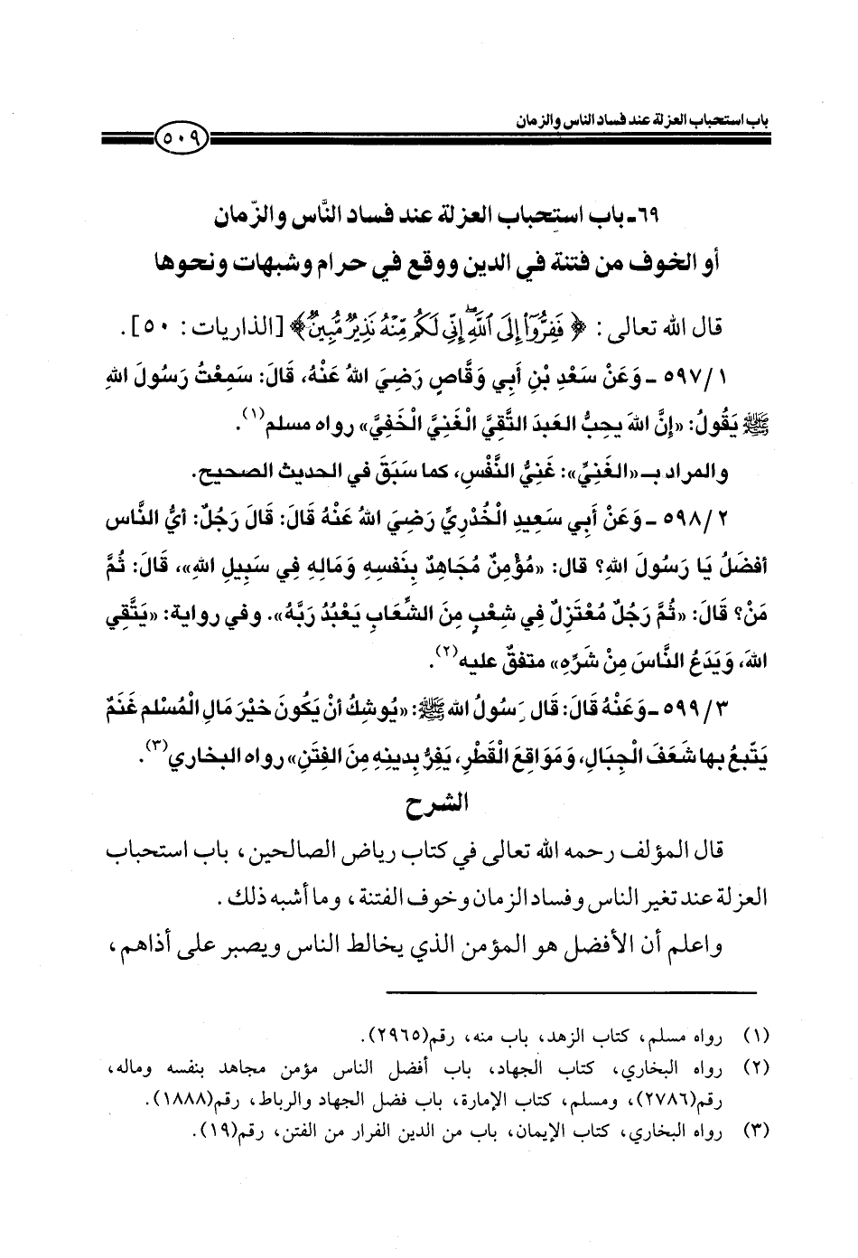 2/598- وعن أبي سعيد الخدري رضي الله عنهُ قال: قال رجلٌ: أي الناس أفضلُ يا رسول الله؟ قال: ((مؤمنٌ مجاهدٌ بنفسه وماله في سبيل الله)) ، قال: ثمَّ من؟ قال: " ثم رجلٌ معتزلٌ في شعب من الشعابِ يعبد ربهُ" وفي رواية: " يتقي الله، ويدع الناس من شره" متفقٌ عليه.