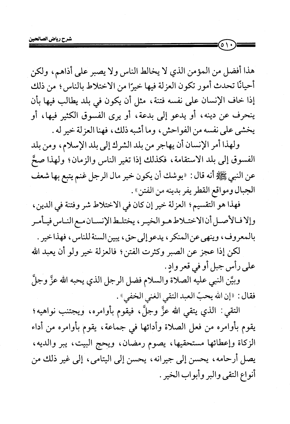 ولهذا أمر الإنسان أن يهاجر من بلد الشرك إلى بلد الإسلام، ومن بلد الفسوق إلى بلد الاستقامة، فكذلك إذا تغير الناس والزمان؛ ولهذا صحَّ عن النبي صلى الله عليه وسلم أنه قال: ((يوشك أن يكون خير مال الرجل غنم يتبع بها شعف الجبال ومواقع القطر يفر بدينه من الفتن)) . فهذا هو التقسيم؛ العزلة خير إن كان في الاختلاط شر وفتنة في الدين، وإلا فالأصل أن الاختلاط هو الخير، يختلط الإنسان مع الناس فيأمر بالمعروف، وينهى عن المنكر، يدعو إلى حق، يبين السنة للناس، فهذا خير. لكن إذا عجز عن الصبر وكثرت الفتن؛ فالعزلة خير ولو أن يعبد الله على رأس جبل أو في قعر وادٍ.