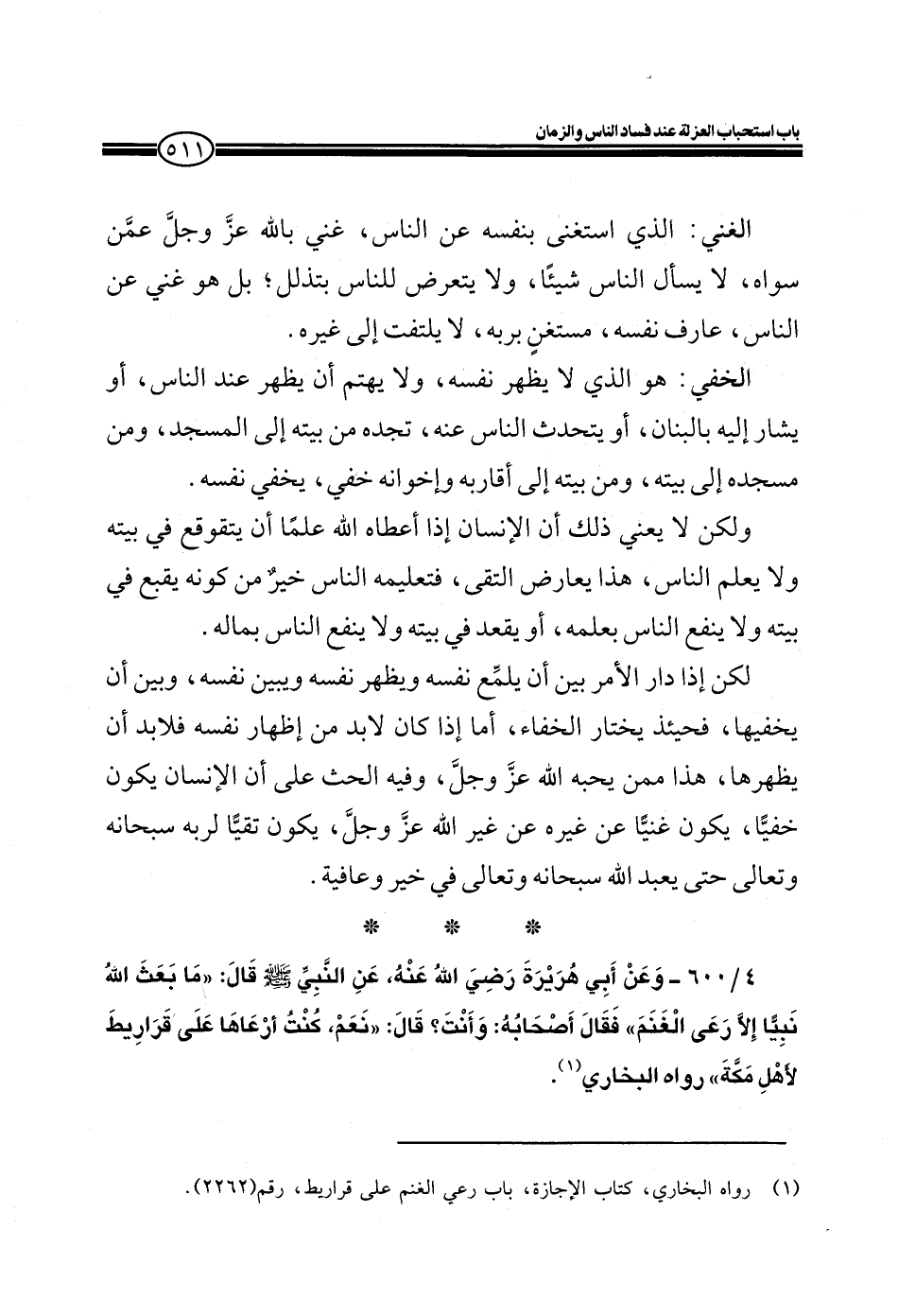4/600- وعن أبي هُريرة رضي الله عنهُ، عن النبي صلى الله عليه وسلم قال: ((ما بعث الله نبياً إلا رعى الغنمَ)) فقال أصحابهُ: وأنت؟ قال: ((نعم، كنت أرعاها على قراريط لأهلِ مكةَ)) رواه البخاري.