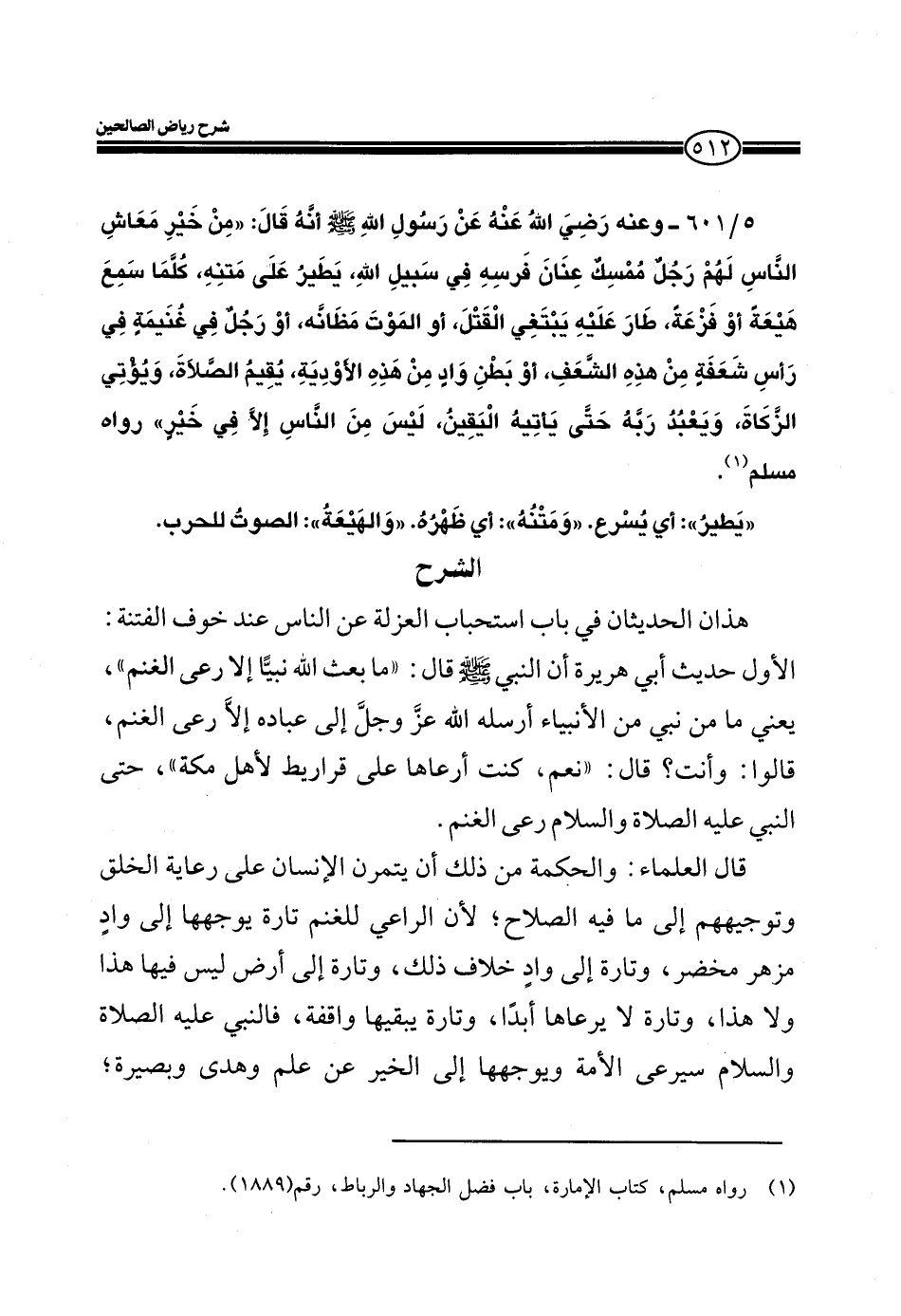 5/601- وعنه رضي الله عنهُ عن رسول الله صلى الله عليه وسلم أنهُ قالَ ((من خير معاش الناس لهم رجلٌ ممسكٌ عنانَ فرسه في سبيل الله، يطيرُ على متنهِ، كلما سمع هيعة أو فزعة، طار عليه يبتغي القتل، أو الموت مظانه، أو رجلٌ في غُنيمةٍ في رأس شعفة من هذه الشعف، أو بطن وادٍ من هذه الأودية، يُقيمُ الصلاة، ويؤتى الزكاة، ويعبد ربه حتى يأتيهُ اليقين، ليس من الناس إلا في خيرٍ)) رواه مسلم.