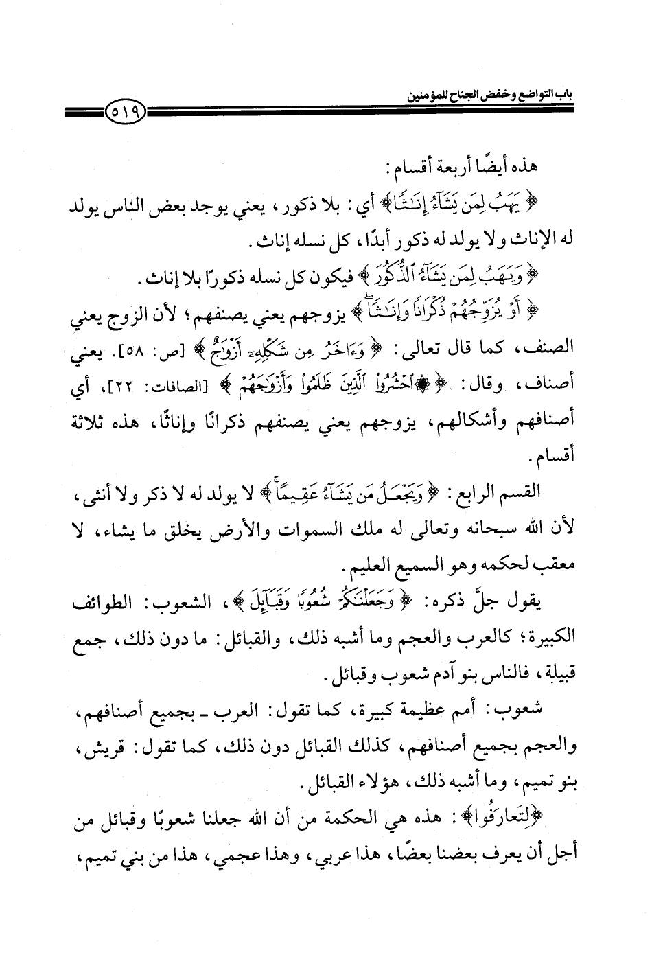 القسم الرابع: (وَيَجْعَلُ مَنْ يَشَاءُ عَقِيماً) لا يولد له لا ذكر ولا أنثى، لأن الله سبحانه وتعالى له ملك السموات والأرض يخلق ما يشاء، لا معقب لحكمه وهو السميع العليم.