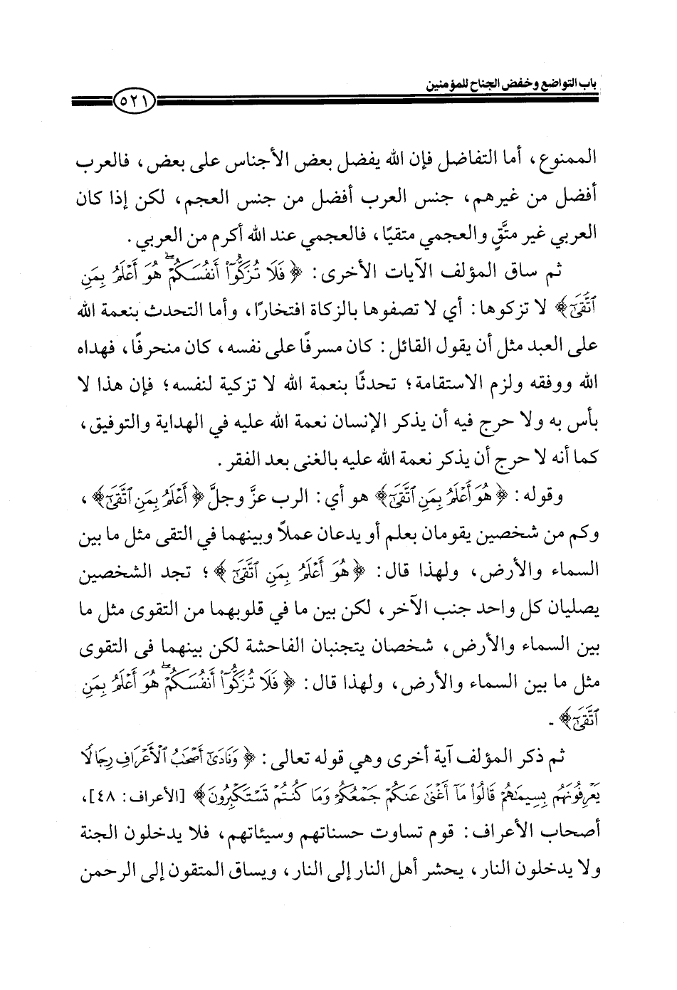 ثم ساق المؤلف الآيات الأخرى: (فَلا تُزَكُّوا أَنْفُسَكُمْ هُوَ أَعْلَمُ بِمَنِ اتَّقَى) لا تزكوها: أي لا تصفوها بالزكاة افتخاراً، وأما التحدث بنعمة الله على العبد مثل أن يقول القائل: كان مسرفاً على نفسه، كان منحرفاً، فهداه الله ووفقه ولزم الإستقامة؛ تحدثاً بنعمة الله لا تزكيه لنفسه؛ فإن هذا لا بأس به ولا حرج فيه أن يذكر الإنسان نعمة الله عليه في الهداية والتوفيق، كما أنه لا حرج أن يذكر نعمة الله عليه بالغنى بعد الفقر.