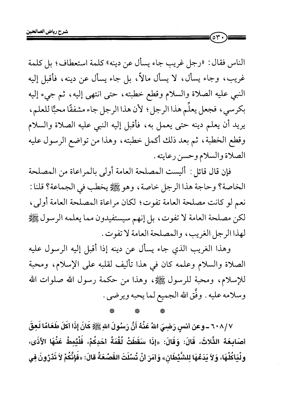 فإن قال قائل: أليست المصلحة العامة أولى بالمراعاة من المصلحة الخاصة؟ وحاجة هذا الرجل خاصة، وهو صلى الله عليه وسلم يخطب في الجماعة؟ قلنا: نعم لو كانت مصلحة العامة تفوت؛ لكان مراعاة المصلحة العامة أولى، لكن مصلحة العامة لا تفوت، بل إنهم سيستفيدون مما يعلمه الرسول صلى الله عليه وسلم لهذا الرجل الغريب، والمصلحة العامة لا تفوت.