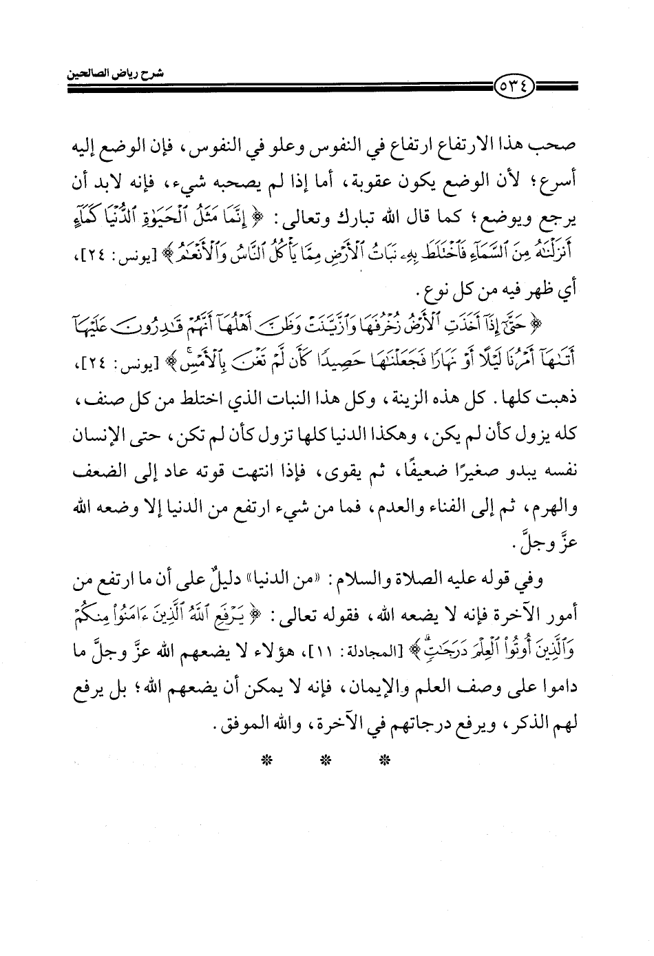 وفي قوله عليه الصلاة والسلام: " ((من الدنيا)) دليلٌ على أن ما ارتفع من أمور الآخرة فإنه لا يضعه الله، فقوله تعالى: (يَرْفَعِ اللَّهُ الَّذِينَ آمَنُوا مِنْكُمْ وَالَّذِينَ أُوتُوا الْعِلْمَ دَرَجَاتٍ) (المجادلة: 11) ، هؤلاء لا يضعهم الله عزّ وجلّ ما داموا على وصف العلم والإيمان، فإنه لا يمكن أن يضعهم الله؛ بل يرفع لهم الذكر، ويرفع درجاتهم في الآخرة، والله الموفق.