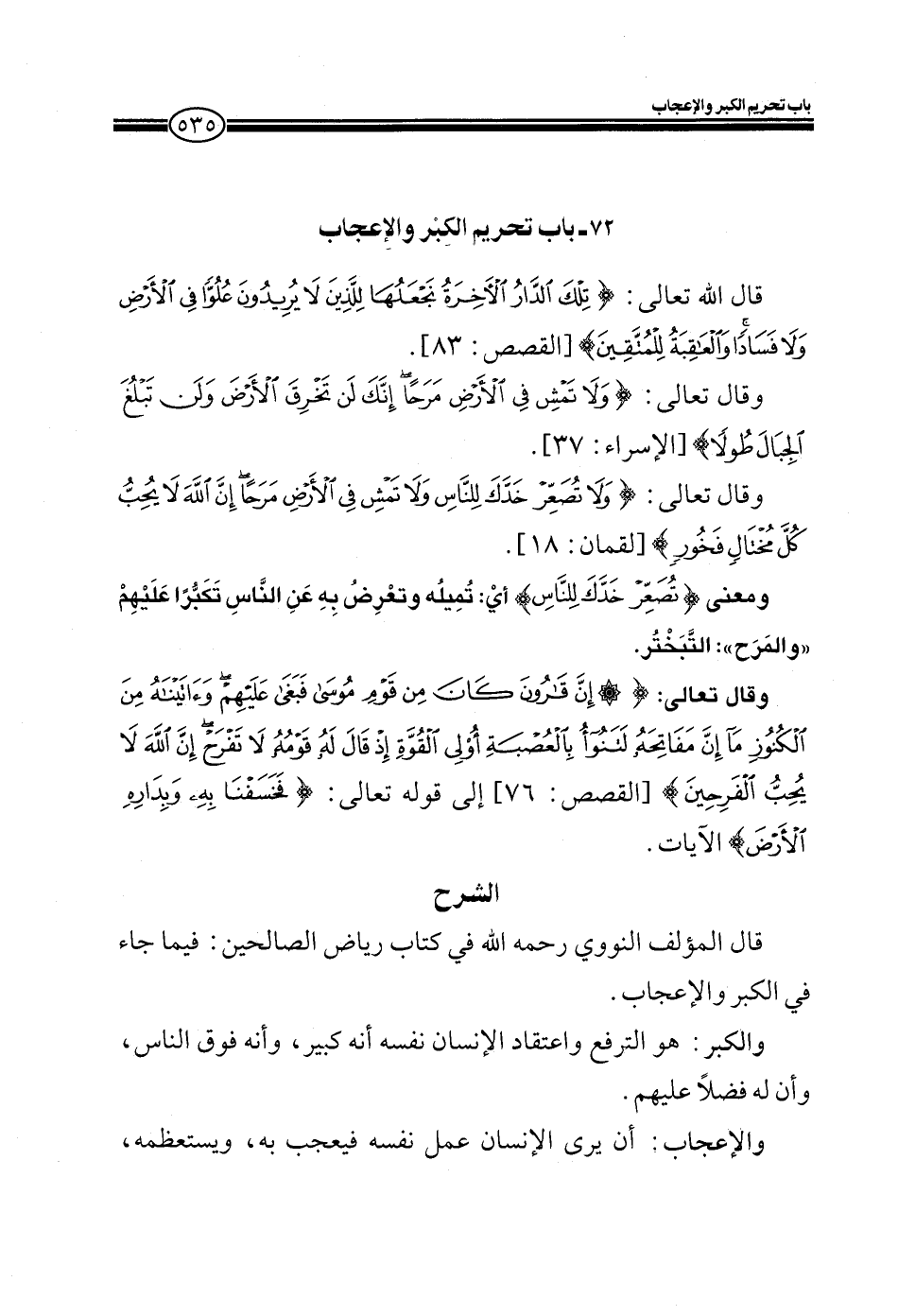 EXقال المؤلف النووي رحمه الله في كتاب رياض الصالحين: فيما جاء في الكبر والإعجاب.