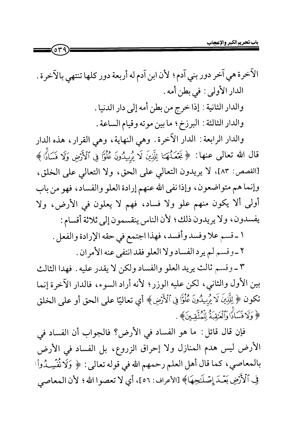 والدار الرابعة: الدار الآخرة. وهي النهاية، وهي القرار، هذه الدار قال الله تعالى عنها: (نَجْعَلُهَا لِلَّذِينَ لا يُرِيدُونَ عُلُوّاً فِي الْأَرْضِ وَلا فَسَاداً) (القصص: 83) ، لا يريدون التعالي على الحق، ولا التعالي على الخلق، وإنما هم متواضعون، وإذا نفى الله عنهم إرادة العلو والفساد، فهو من باب أولى ألا يكون منهم علو ولا فساد، فهم لا يعلون في الأرض، ولا يفسدون، ولا يكون منهم علو ولا فساد، فهم لا يعلون في الأرض، ولا يفسدون، ولا يريدون ذلك؛ لأن الناس ينقسمون إلى ثلاثة أقسام: