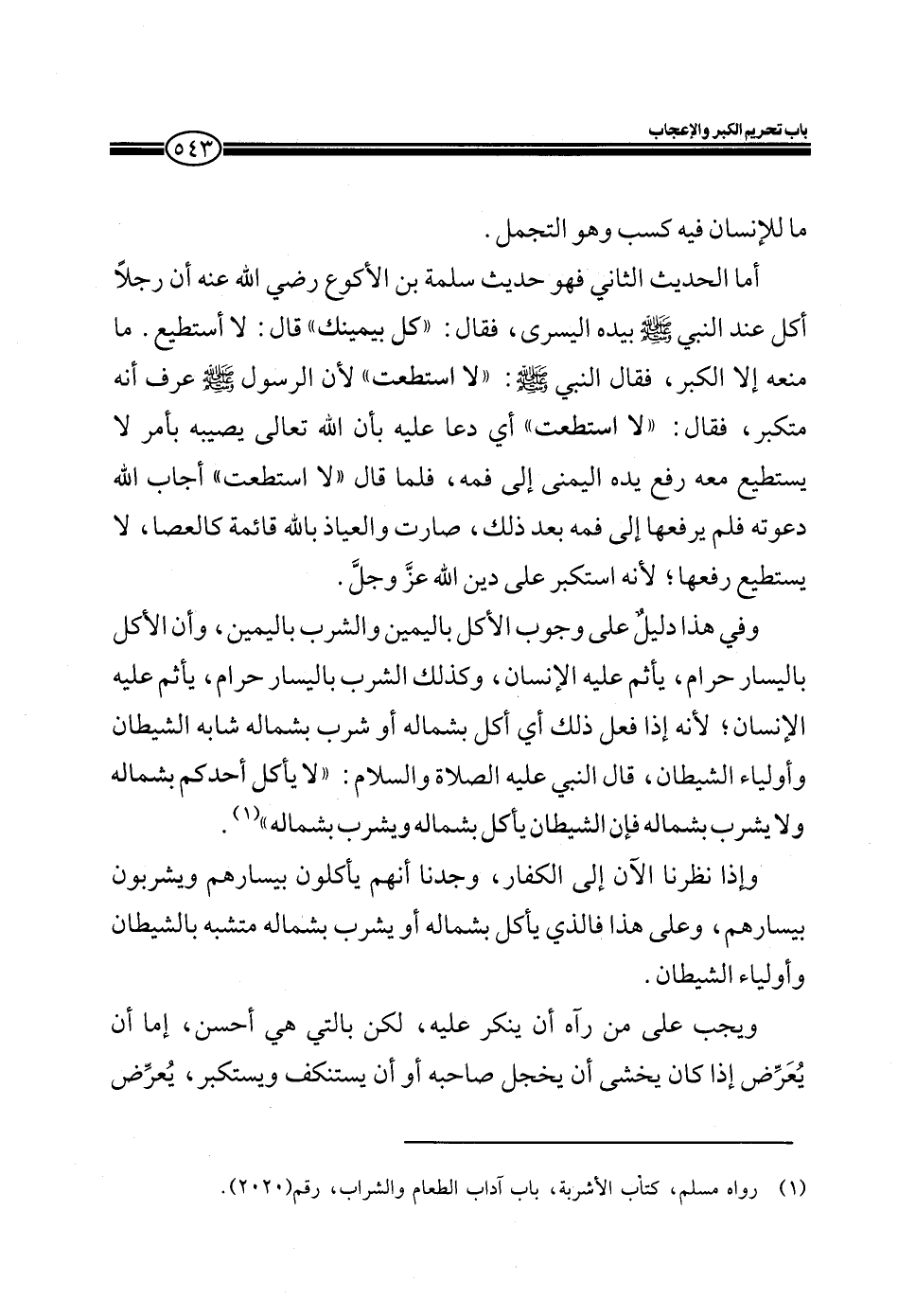 أما الحديث الثاني فهو حديث سلمة بن الأكوع رضي الله عنه أن رجلاً أكل عند النبي صلى الله عليه وسلم بيده اليسرى، فقال: ((كل بيمينك)) قال: لا أستطيع. ما منعه إلا الكبر، فقال النبي صلى الله عليه وسلم: " لا استطعت" لأن الرسول صلى الله عليه وسلم عرف أنه متكبر، فقال: " لا استطعت" أي دعا عليه بأن الله تعالى يصيبه بأمر لا يستطيع معه رفع يده اليمنى إلى فمه، فلما قال ((لا استطعت)) أجاب الله دعوته فلم يرفعها إلى فمه بعد ذلك، صارت والعياذ بالله قائمة كالعصا، لا يستطيع رفعها؛ لأنه استكبر على دين الله عزّ وجلّ.