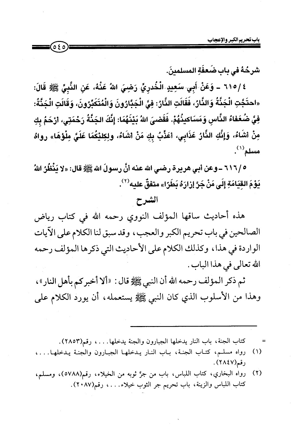 EXهذه أحاديث ساقها المؤلف النووي رحمه الله في كتاب رياض الصالحين في باب تحريم الكبر والعجب، وقد سبق لنا الكلام على الآيات الواردة في هذا، وكذلك الكلام على الأحاديث التي ذكرها المؤلف رحمه الله تعالى في هذا الباب.