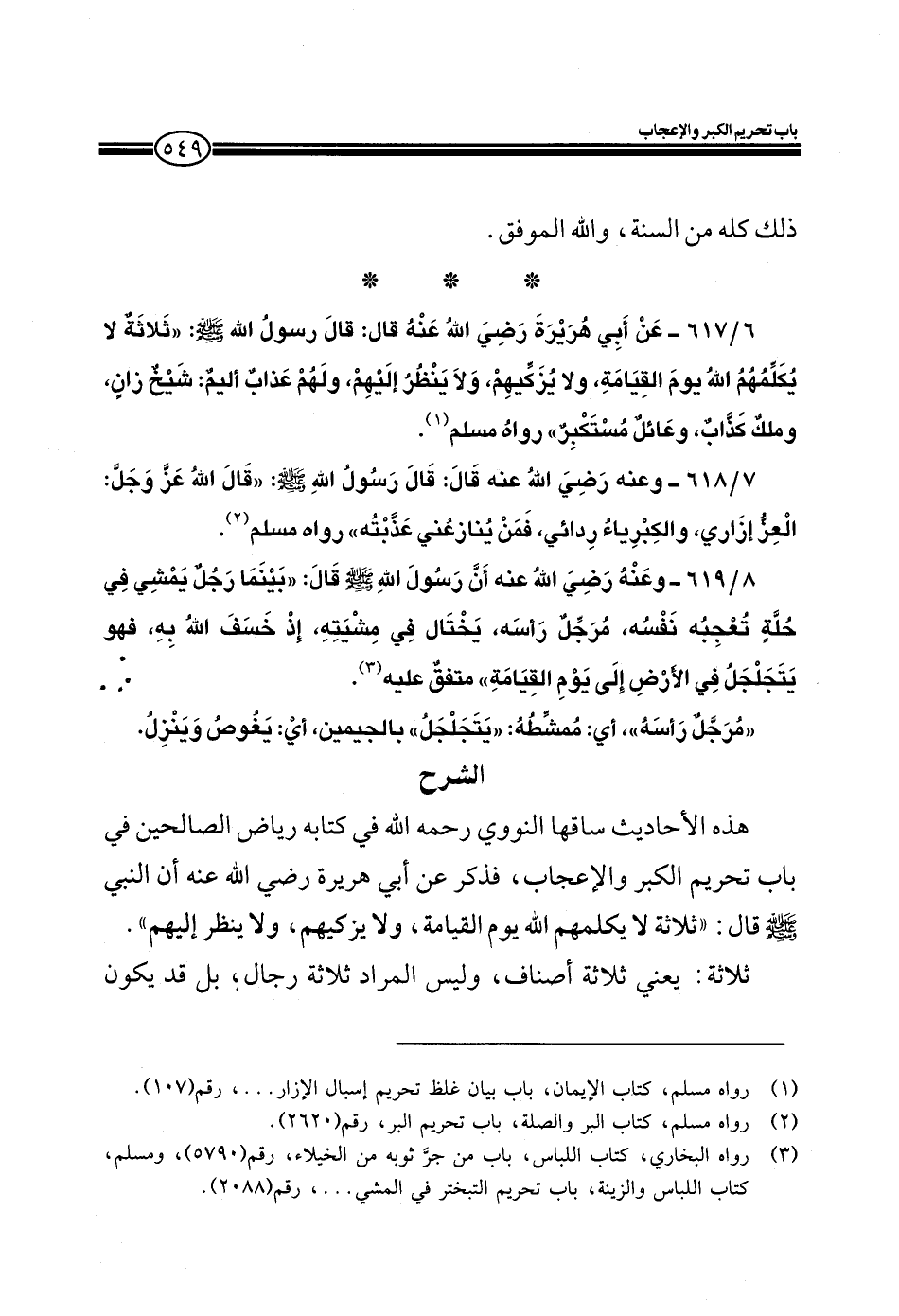 EXهذه الأحاديث ساقها النووي رحمه الله في كتابه رياض الصالحين في باب تحريم الكبر والإعجاب، فذكر عن أبي هريرة رضي الله عنه أن النبي صلى الله عليه وسلم قال: ((ثلاثة لا يكلمهم الله يوم القيامة، ولا يزكيهم، ولا ينظر إليهم)) ثلاثة: يعني ثلاثة أصناف، وليس المراد ثلاثة رجال، بل قد يكون