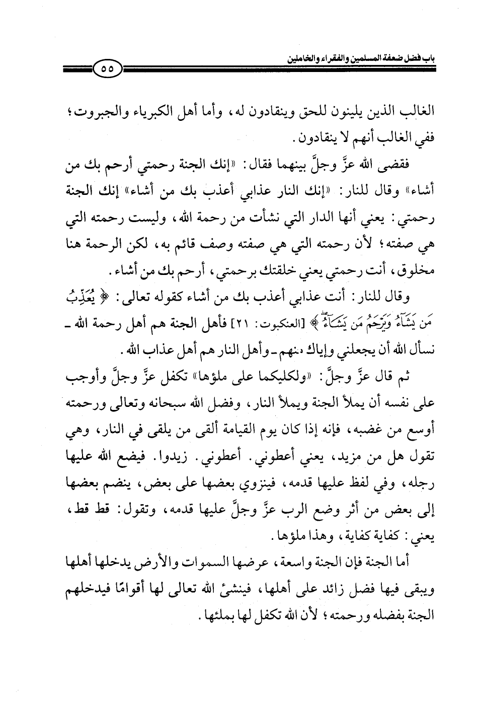 فقضى الله عز وجل بينهما فقال: ((إنك الجنة رحمتي أرحم بك من أشاء)) وقال للنار: ((إنك النار عذابي أعذب بك من أشاء)) إنك الجنة رحمتي: يعني أنها الدار التي نشأت من رحمة الله، وليست رحمته التي هي صفته؛ لأن رحمته التي هي صفته وصف قائم به، لكن الرحمة هنا مخلوق، أنت رحمتي يعني خلقتك برحمتي، أرحم بك من أشاء.