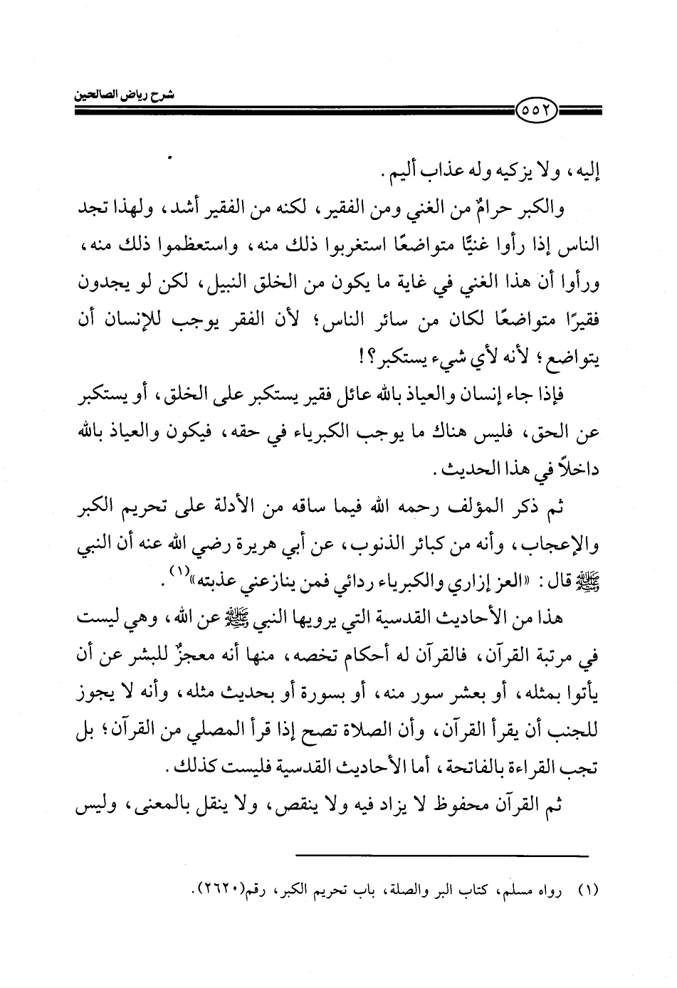ثم ذكر المؤلف رحمه الله فيما ساقه من الأدلة على تحريم الكبر والإعجاب، وأنه من كبائر الذنوب، عن أبي هريرة رضي الله عنه أن النبي صلى الله عليه وسلم قال: ((العز إزاري والكبرياء ردائى فمن ينازعني عذبته)) .