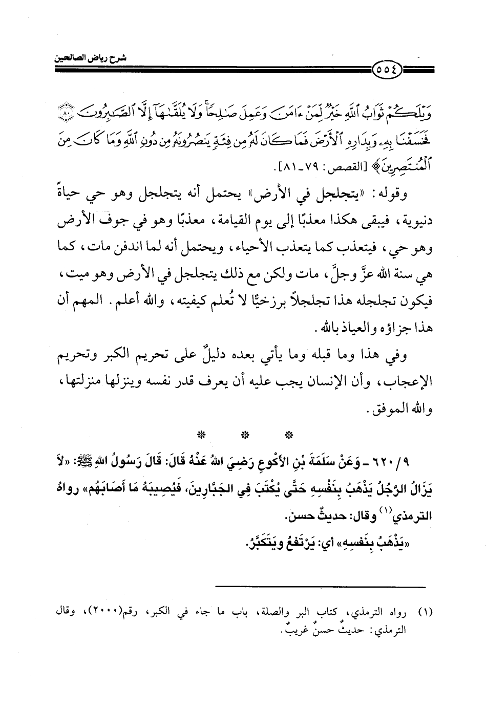 9/620- وعن سلمة بن الأكوع رضي الله عنه قال: قال رسول الله صلى الله عليه وسلم: ((لا يزال الرجل يذهب بنفسه حتى يُكتبَ في الجبارين، فيصيبهُ ما أصابهم)) رواه الترمذي وقال: حديث حسن.