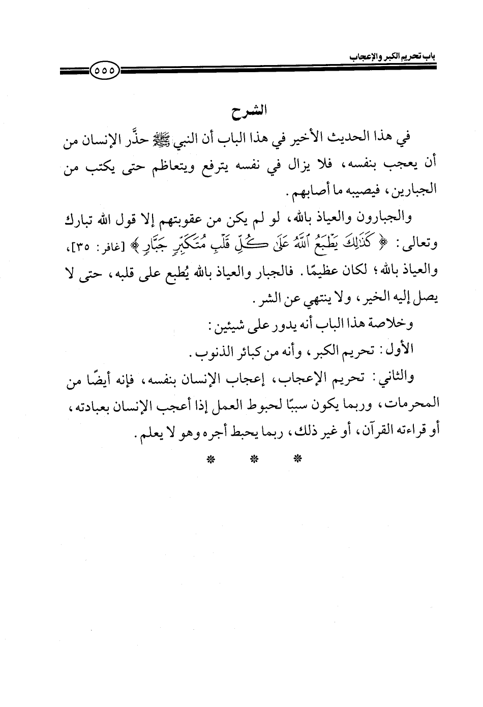 والثاني: تحريم الإعجاب، إعجاب الإنسان بنفسه، فإنه أيضاً من المحرمات، وربما يكون سبباً لحبوط العمل إذا أعجب الإنسان بعبادته، أو قراءته القرآن، أو غير ذلك، ربما يحبط أجره وهو لا يعلم.