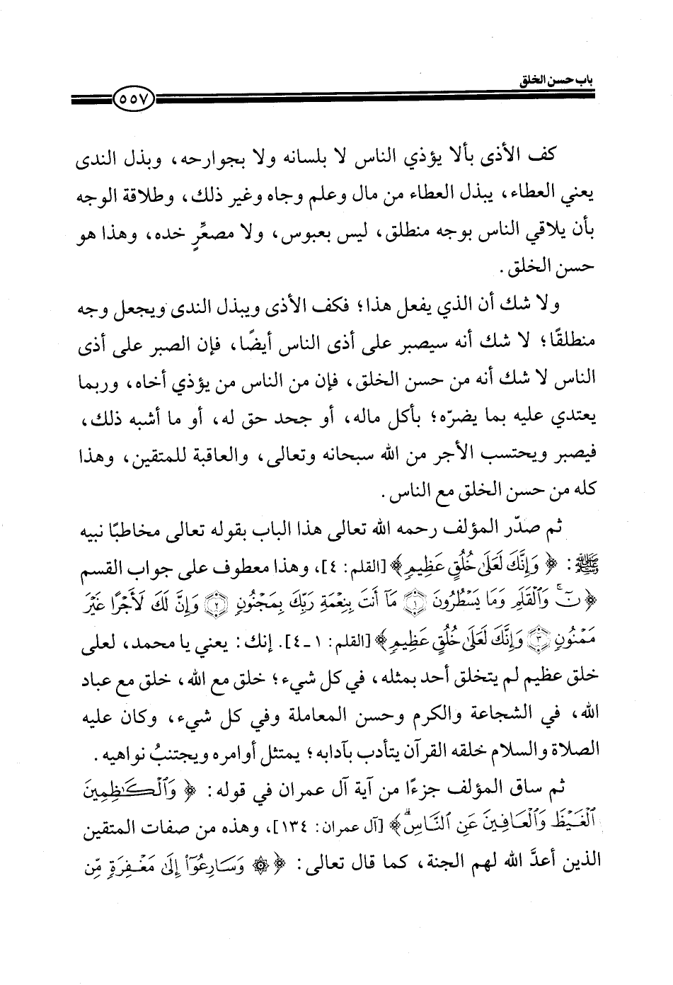 ثم صدّر المؤلف رحمه الله تعالى هذا الباب بقوله تعالى مخاطباً نبيه صلى الله عليه وسلم (وَإِنَّكَ لَعَلَى خُلُقٍ عَظِيمٍ) (القلم: 4) ، وهذا معطوف على جواب القسم (نْ وَالْقَلَمِ وَمَا يَسْطُرُونَ) (مَا أَنْتَ بِنِعْمَةِ رَبِّكَ بِمَجْنُونٍ) (وَإِنَّ لَكَ لَأَجْراً غَيْرَ مَمْنُونٍ) (القلم: 1-4) . إنك: يعني يا محمد، لعلى خلق عظيم لم يتخلق أحد بمثله، في كل شيء؛ خلق مع الله، خلق مع عباد الله، في الشجاعة والكرم وحسن المعاملة وفي كل شيء، وكان عليه الصلاة والسلام خلقه القرآن يتأدب بآدابه؛ يمتثل أوامره ويجتنبُ نواهيه.