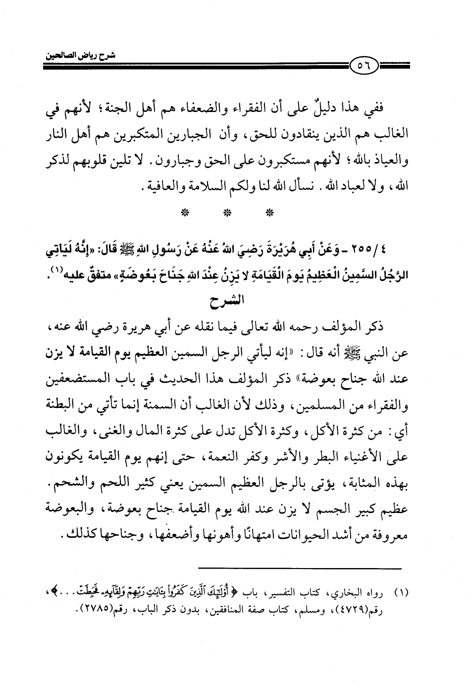 4/255 ـ وعن أبي هريرة رضي الله عنه عن رسول الله صلى الله عليه وسلم قال: ((إنه ليأتي الرجل السمين العظيم يوم القيامة لا يزن عند الله جناح بعوضة)) متفق عليه.