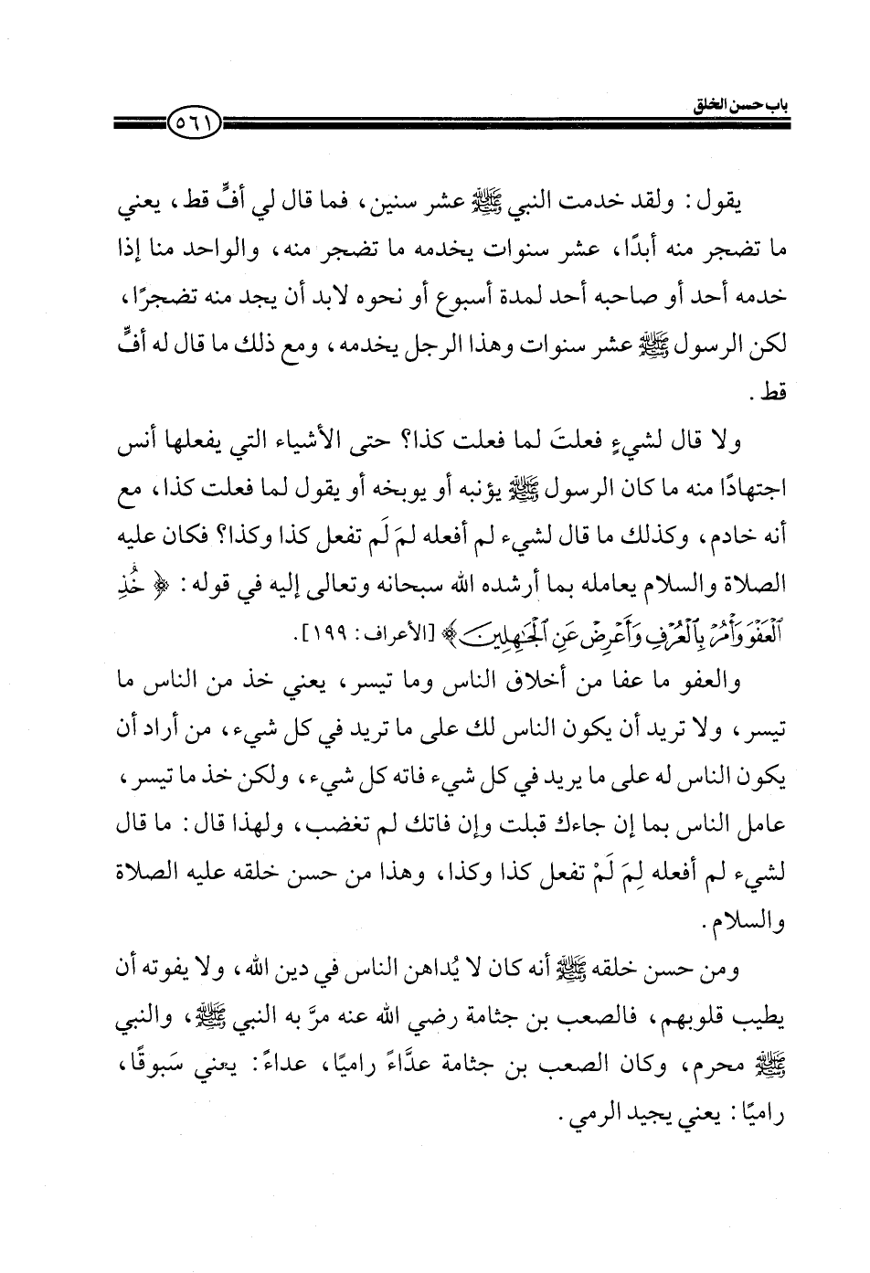 ولا قال لشيءٍ فعلت لما فعلت كذا؟ حتى الأشياء التي يفعلها أنس اجتهاداً منه ما كان الرسول صلى الله عليه وسلم يؤنبه أو يوبخه أو يقول لما فعلت كذا، مع أنه خادم، وكذلك ما قال لشيء لم أفعله لم لم تفعل كذا وكذا؟ فكان عليه الصلاة والسلام يعامله بما أرشده الله سبحانه وتعالى إليه في قوله: (خُذِ الْعَفْوَ وَأْمُرْ بِالْعُرْفِ وَأَعْرِضْ عَنِ الْجَاهِلِينَ) (الأعراف: 199) .