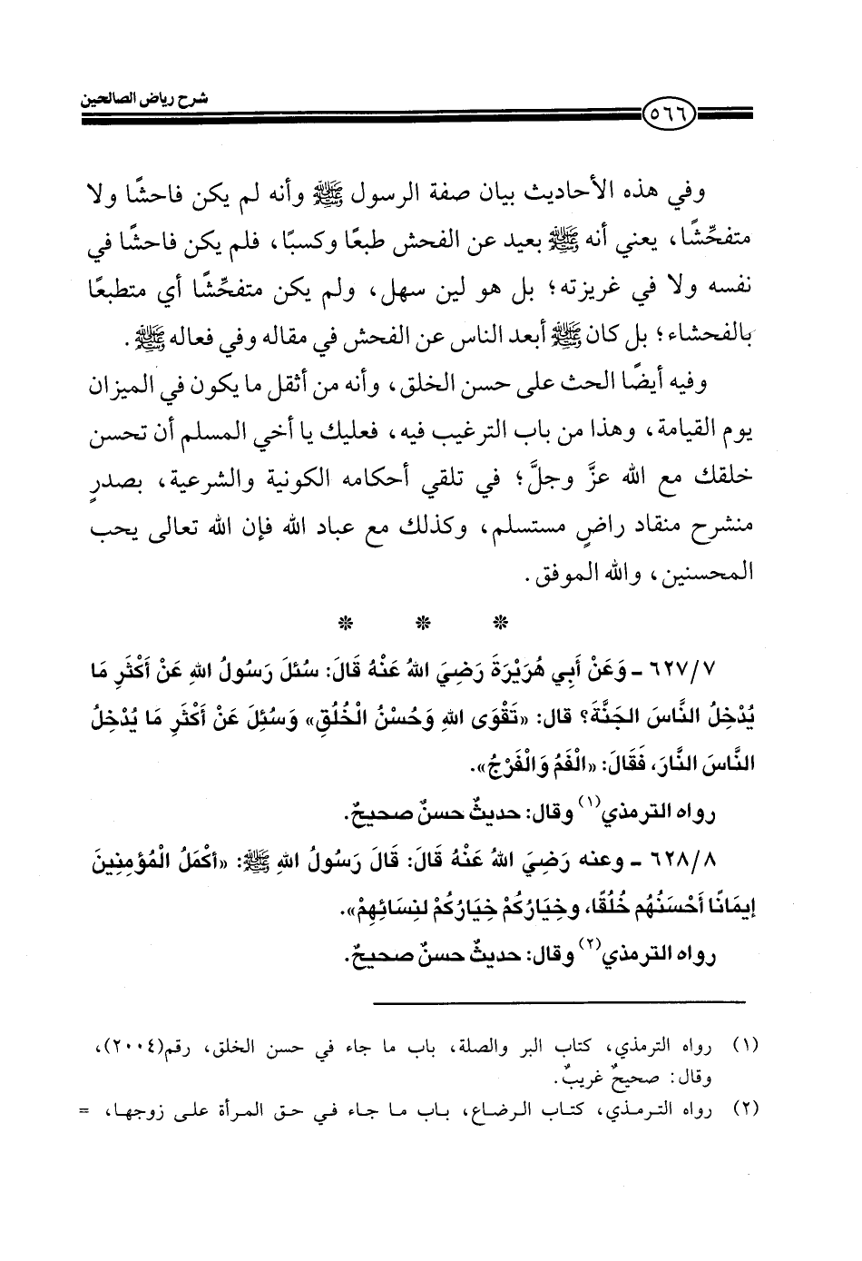 7/627- وعن أبي هريرة رضي الله عنه قال: سئل رسول الله صلى الله عليه وسلم عن أكثر ما يدخل الناس الجنة؟ قال: تقوى الله وحسنُ الخلقِ" وسئل عن أكثر ما يدخل الناس النار، فقال: " الفمُ والفرجُ".