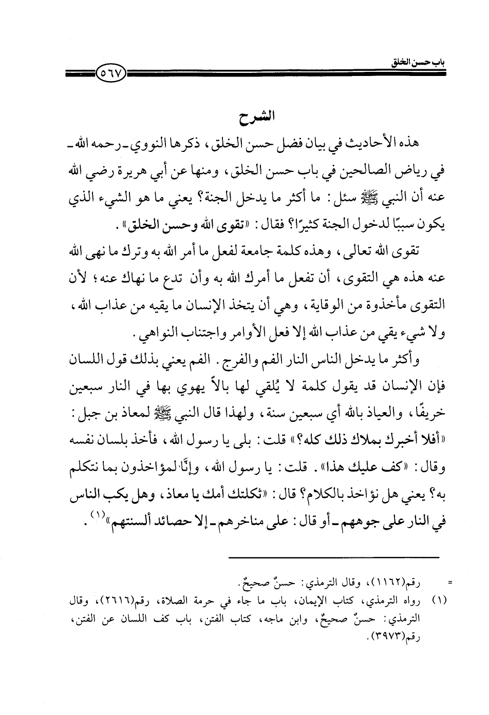 وأكثر ما يدخل الناس النار الفم والفرج. الفم يعني بذلك قول اللسان فإن الإنسان قد يقول كلمة لا يُلقي لها بالاً يهوي بها في النار سبعين خريفاً، والعياذ بالله أي سبعين سنة، ولهذا قال النبي صلى الله عليه وسلم لمعاذ بن جبل: (أفلا أخبرك بملاك ذلك كله؟) قلت بلى يا رسول الله، فأخذ بلسان نفسه وقال: (كف عليك هذا) قلت: يا رسول الله، وإنا لمؤاخذون بما نتكلم به؟ يعني هل نؤاخذ بالكلام؟ قال (ثكلتك أمك يا معاذ، وهل يكب الناس في النار على وجوههم-. أو قال: " على مناخرهم- إلا حصائد ألسنتهم) .