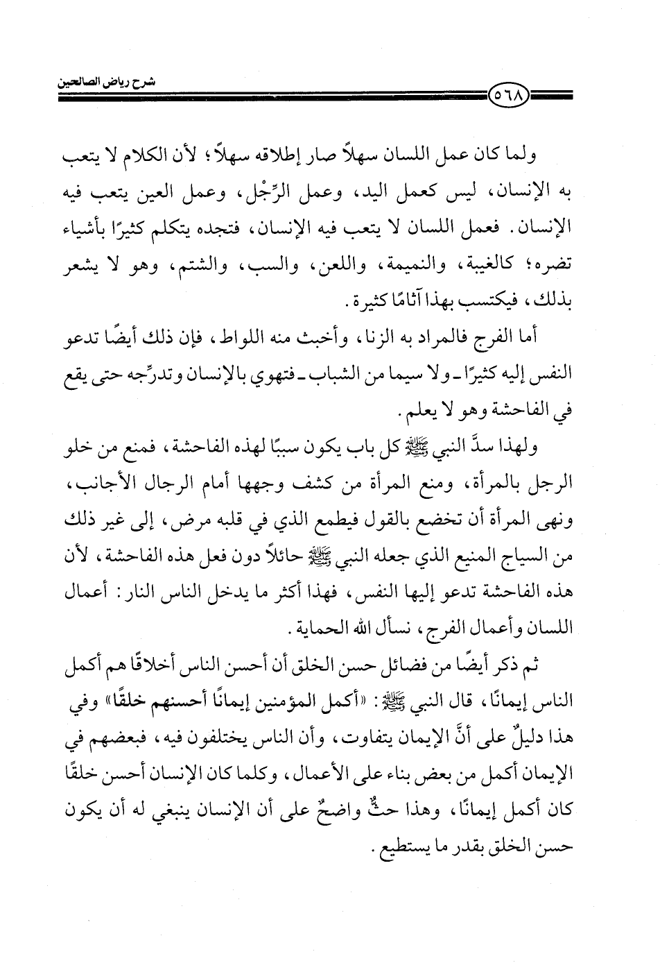 ولما كان عمل اللسان سهلاً صار إطلاقه سهلاً؛ لأن الكلام لا يتعب به الإنسان، ليس كعمل اليد، وعمل الرجل، وعمل العين يتعب فيه الإنسان. فعلم اللسان لا يتعب في الإنسان، فتجده يتكلم كثيراً بأشياء تضره؛ كالغيبة، والنميمة، واللعن، والسب، والشتم، وهو لا يشعر بذلك، فيكتسب بهذا آثاماً كثيرة.