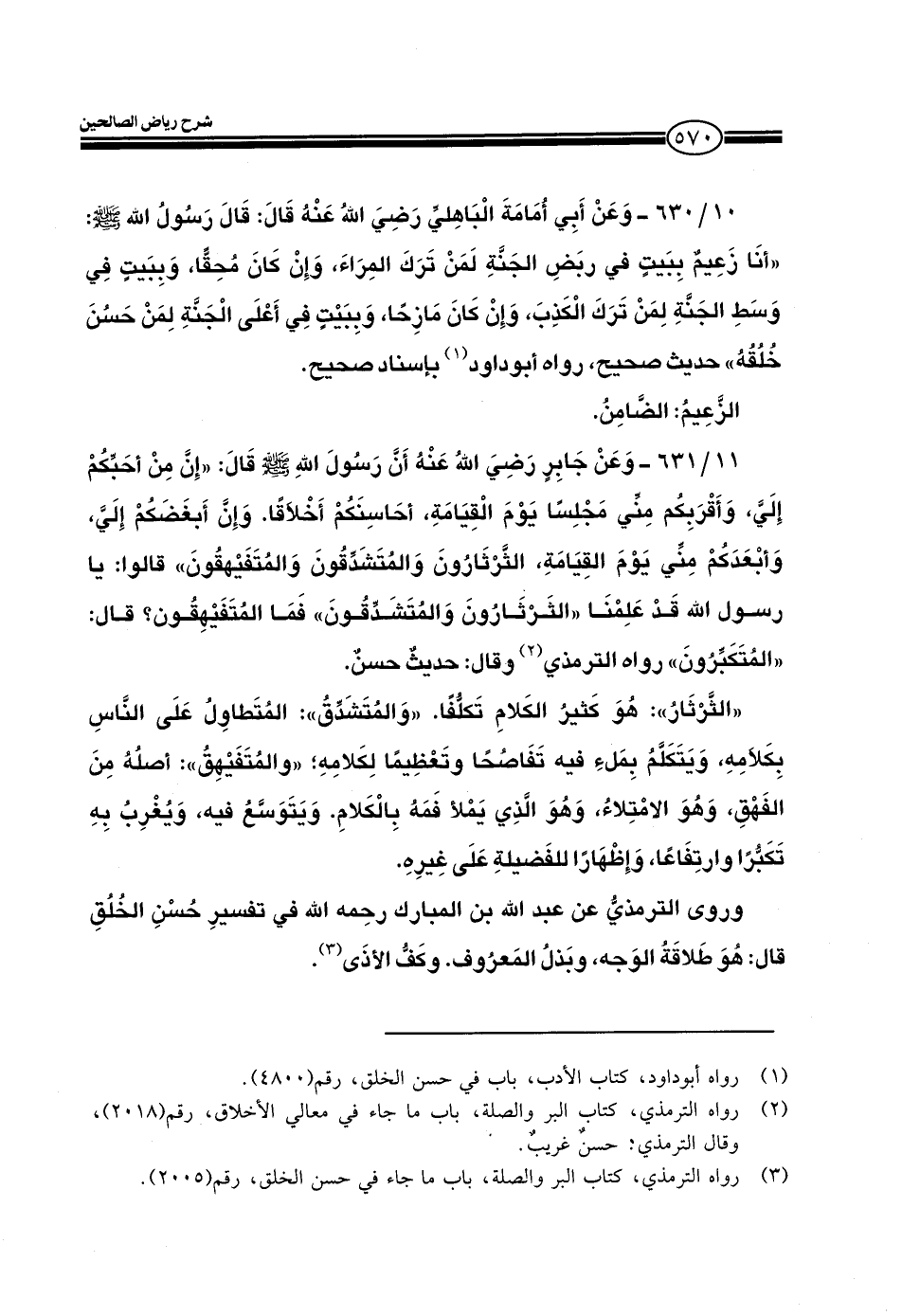 10/630- وعن أبي أمامة الباهلي رضي الله عنه قال: قال رسول الله صلى الله عليه وسلم: (أنا زعيم ببيت في ربضِ الجنةِ لمن ترك المراء، وإن كان مُحقاً، وببيت في وسط الجنة لمن ترك الكذب، وإن كان مازحاً، وببيت في أعلى الجنة لمن حسن خلقه) حديث صحيح، رواه أبو داود بإسناد صحيح.