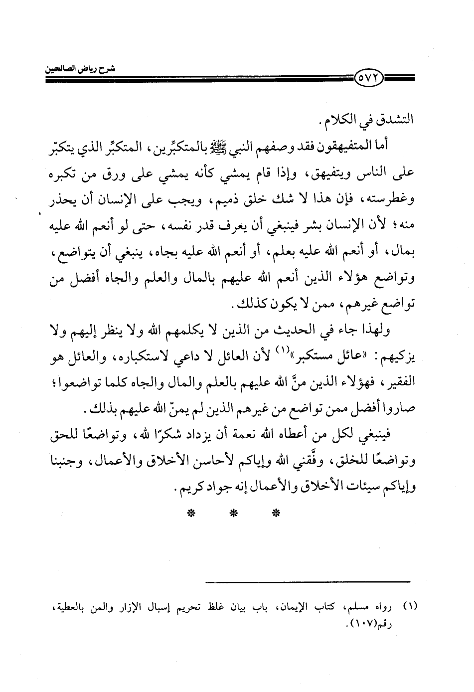 أما المتفيهقون فقد وصفهم النبي صلى الله عليه وسلم بالمتكبرين، المتكبر الذي يتكبر على الناس ويتفيهق، وإذا قام يمشي كأنه يمشي على روق من تكبره وغطرسته، فإن هذا لا شك خلق ذميم، ويجب على الإنسان أن يحذر منه؛ لأن الإنسان بشر فينبغي أن يعرف قدر نفسه، حتى لو أنعم الله عليه بمال، أو أنعم الله عليه بعلم، أو أنعم الله عليه بجاه، فينبغي أن يتواضع، وتواضع هؤلاء الذين أنعم الله عليهم بالمال والعلم والجاه افضل من تواضع غيرهم، ممن لا يكون كذلك.