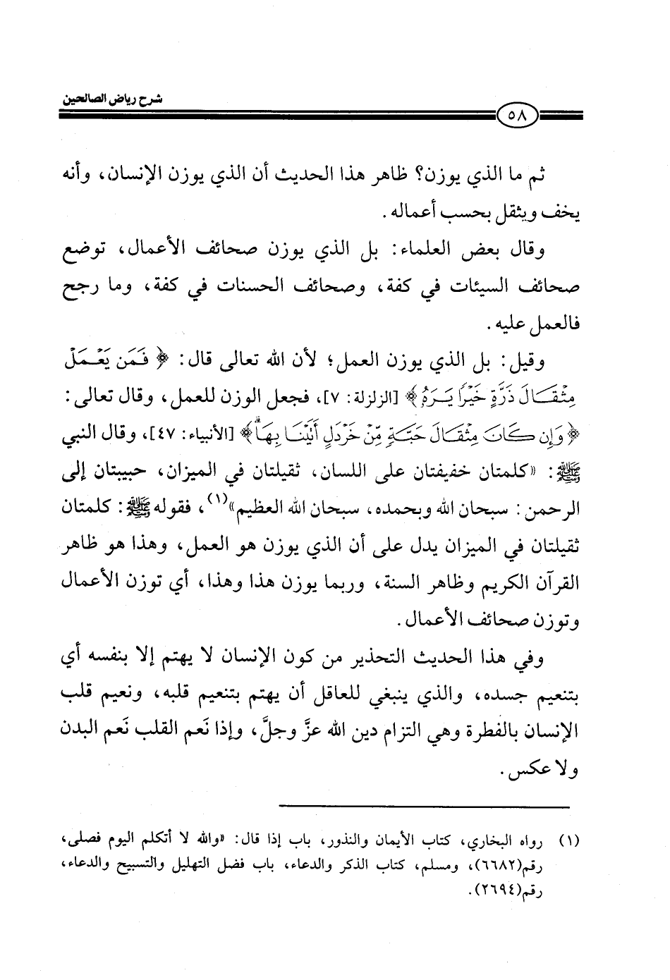 وقيل: بل الذي يوزن العمل؛ لأن الله تعالى قال: (فَمَنْ يَعْمَلْ مِثْقَالَ ذَرَّةٍ خَيْراً يَرَهُ) [الزلزلة: 7] ، فجعل الوزن للعمل، وقال تعالى: (وَإِنْ كَانَ مِثْقَالَ حَبَّةٍ مِنْ خَرْدَلٍ أَتَيْنَا بِهَا) (الانبياء: 47) ، وقال النبي صلى الله عليه وسلم: ((كلمتان خفيفتان على اللسان، ثقيلتان في الميزان، حبيبتان إلى الرحمن: سبحان الله وبحمده، سبحان الله العظيم)) ، فقوله صلى الله عليه وسلم: كلمتان ثقيلتان في الميزان يدل على أن الذي يوزن هو العمل، وهذا هو ظاهر القرآن الكريم وظاهر السنة، وربما يوزن هذا وهذا، أي توزن الأعمال وتوزن صحائف الأعمال.