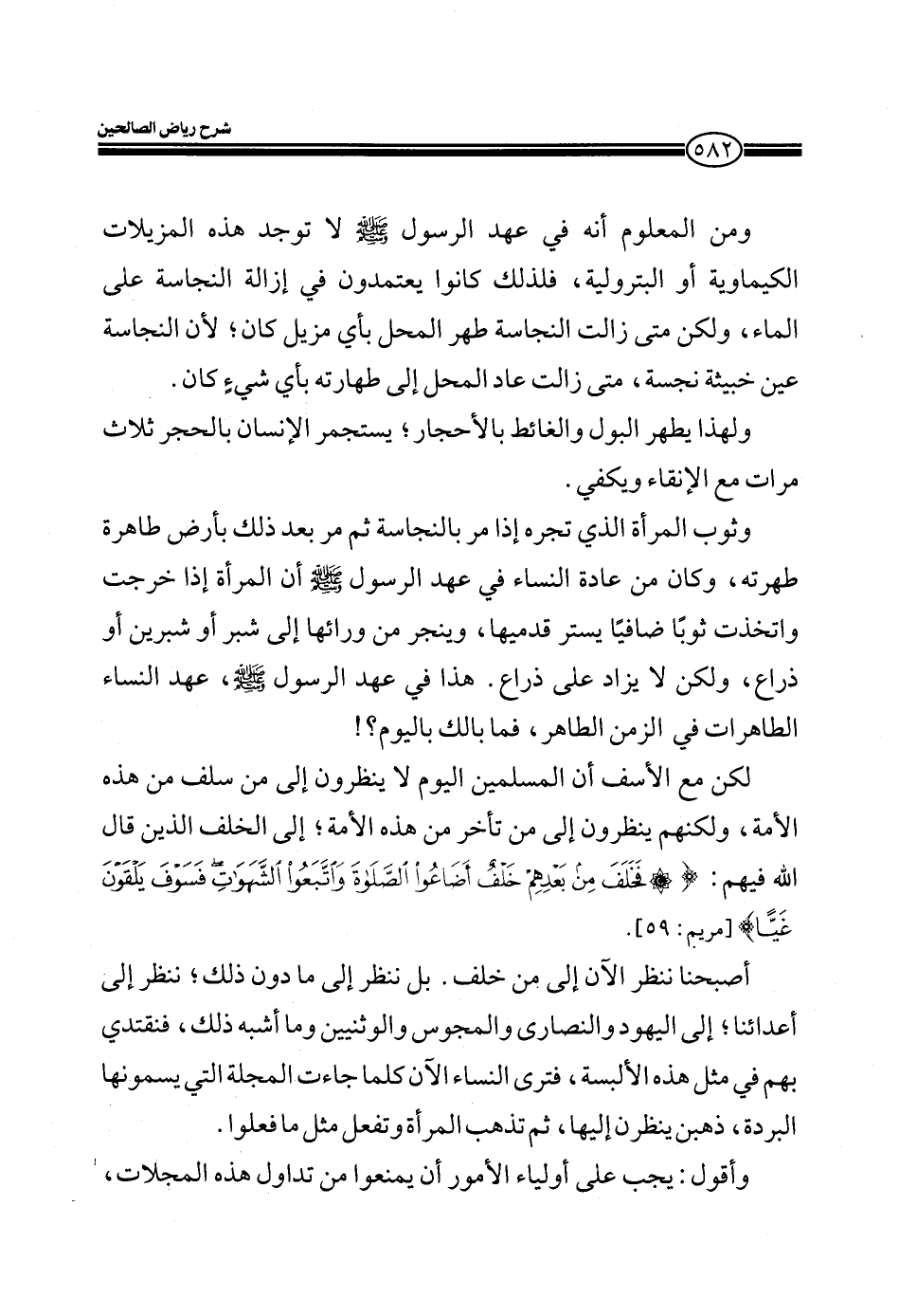 وثوب المرأة الذي تجره إذا مر بالنجاسة ثم مر بعد ذلك بأرض طاهرة طهرته، وكان من عادة النساء في عهد الرسول صلى الله عليه وسلم أن المرأة إذا خرجت واتخذت ثوباً ضافياً يستر قدميها، وينجر من ورائها إلى شبر أو شبرين أن ذراع، ولكن لا يزيد على ذراع. هذا في عهد الرسول صلى الله عليه وسلم، عهد النساء الطاهرات في الزمن الطاهر، فما بالك اليوم؟!