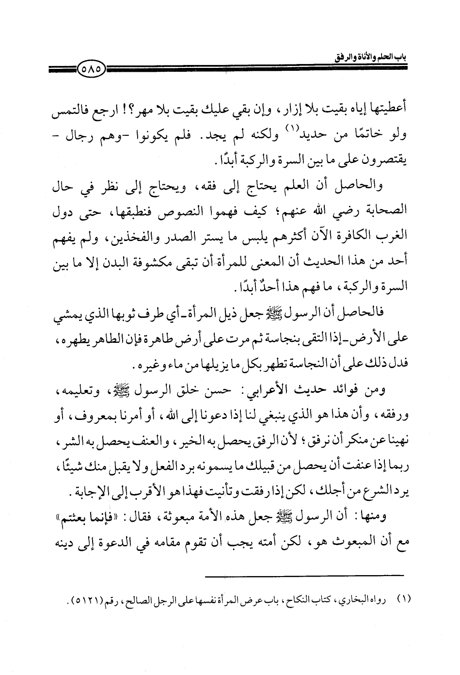 والحاصل أن العلم يحتاج إلى فقه، ويحتاج إلى نظر في حال الصحابة رضي الله عنهم؛ كيف فهموا النصوص فنطبقها، حتى دول الغرب الكافرة الآن أكثرهم يلبس ما يستر الصدر والفخذين، ولم يفهم أحد من هذا الحديث أن المعنى للمرأة ان تبقى مكشوفة البدن إلا ما بين السرة والركبة، ما فهم هذا أحدٌ أبداً.