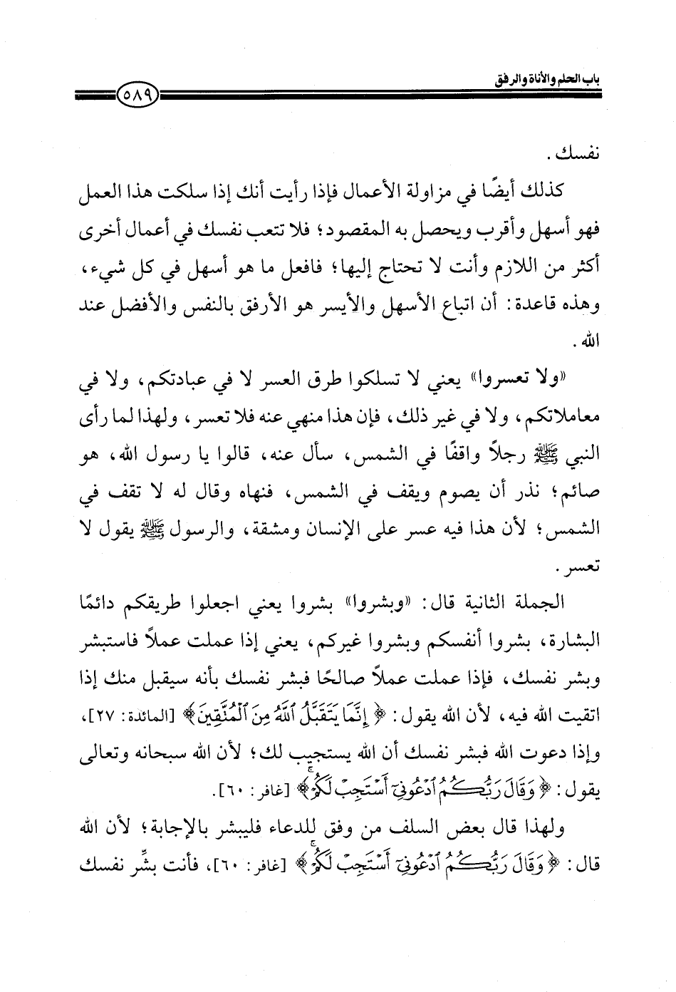 كذلك أيضاً في مزاولة الأعمال إذا رأيت أنك إذا سلكت هذا العمل فهو أسهل وأقرب ويحصل به المقصود؛ فلا تتعب نفسك في أعمال أخرى أكثر من اللازم وأنت لا تحتاج إليها؛ فافعل ما هو أسهل في كل شيء، وهذه قاعدة: أن اتباع الأسهل والأيسر هو الأرفق بالنفس والأفضل عند الله.