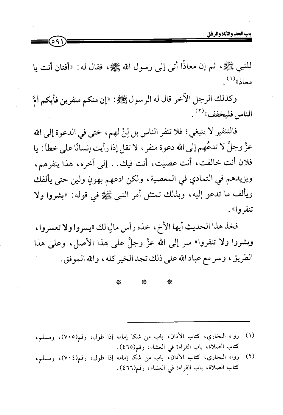 فخذ هذا الحديث أيها الأخ، خذه رأس مالٍ لك ((يسروا ولا تعسروا، وبشروا ولا تنفروا)) سر إلى الله عزّ وجلّ على هذا الأصل، وعلى هذا الطريق، وسر مع عباد الله على ذلك تجد الخير كله، والله الموفق.