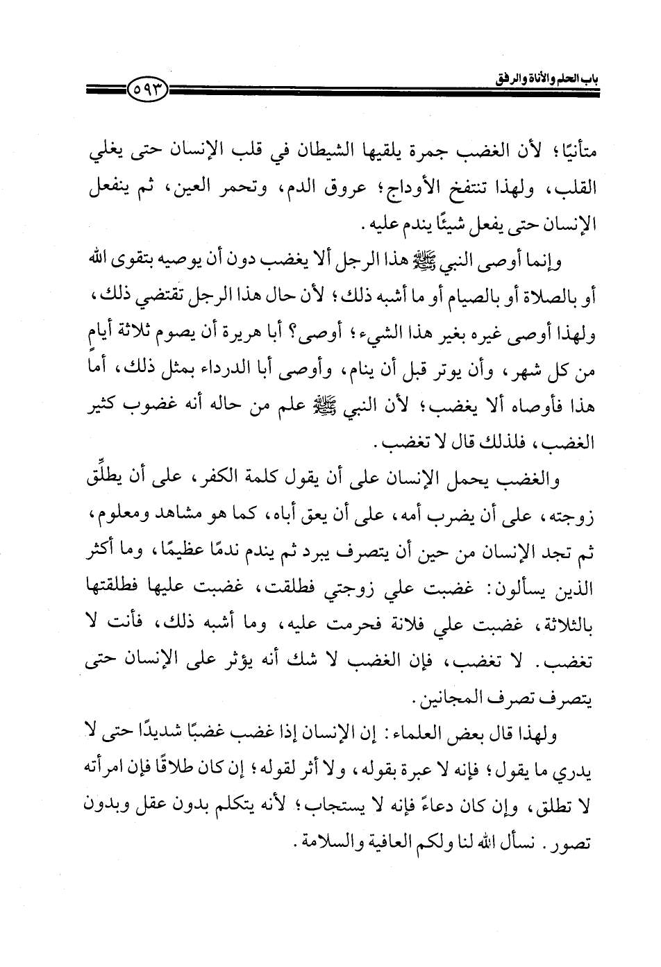 وإنما أوصى النبي صلى الله عليه وسلم هذا الرجل ألا يغضب دون أن يوصيه بتقوى الله أو بالصلاة أو بالصيام أو ما أشبه ذلك؛ لأن حال هذا الرجل تقتضي ذلك، ولهذا أوصى غيره بغير هذا الشيء؛ أوصى؟ أبا هريرة أن يصوم ثلاثة أيام من كل شهر، وأن يوتر قبل أن ينام، وأوصى أبا الدرداء بمثل ذلك، أما هذا فأوصاه ألا يغضب؛ لأن النبي صلى الله عليه وسلم علم من حاله أنه غضوب كثير الغضب، فلذلك قال لا تغضب.