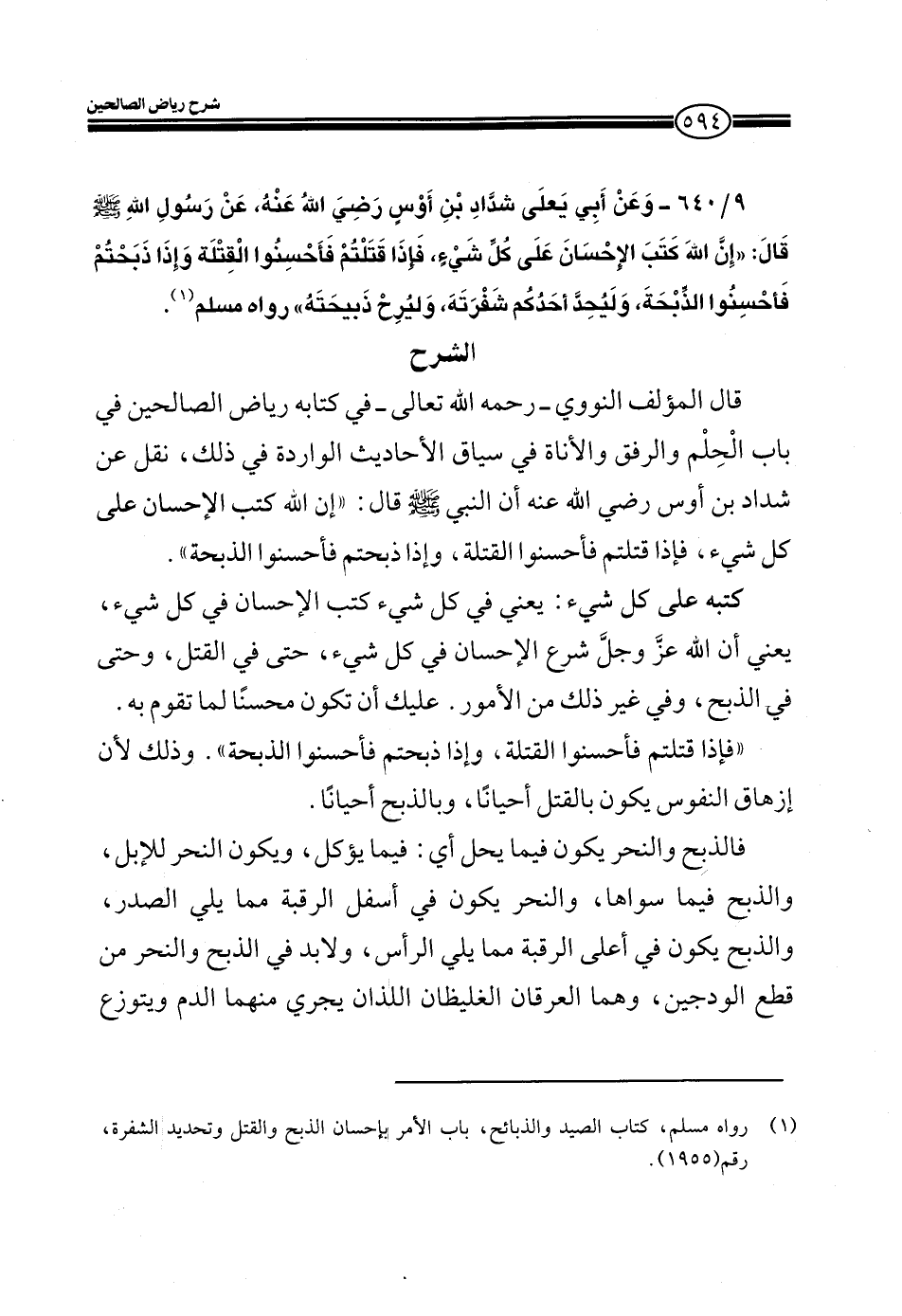 EXقال المؤلف النووي -رحمه الله تعالى- في كتابه رياض الصالحين في باب الحِِلم والرفق والأناة في سياق الأحاديث الواردة في ذلك، نقل عن شداد بن أوس رضي الله عنه أن النبي صلى الله عليه وسلم قال: ((إن الله كتب الإحسان على كل شيء، فإذا قتلتم فأحسنوا القتلة، وإذا ذبحتم فأحسنوا الذبحة)) .