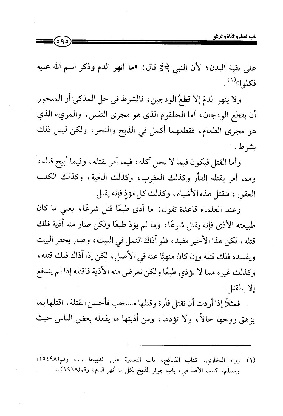 وأما القتل فيكون فيما لا يحل أكله، فيما أمر بقتله، وفيما أبيح قتله، ومما أمر بقتله الفأر كذلك العقرب، وكذلك الحية، وكذلك الكلب العقور، فتقتل هذه الأشياء، وكذلك كل مؤذٍ فإنه يقتل.