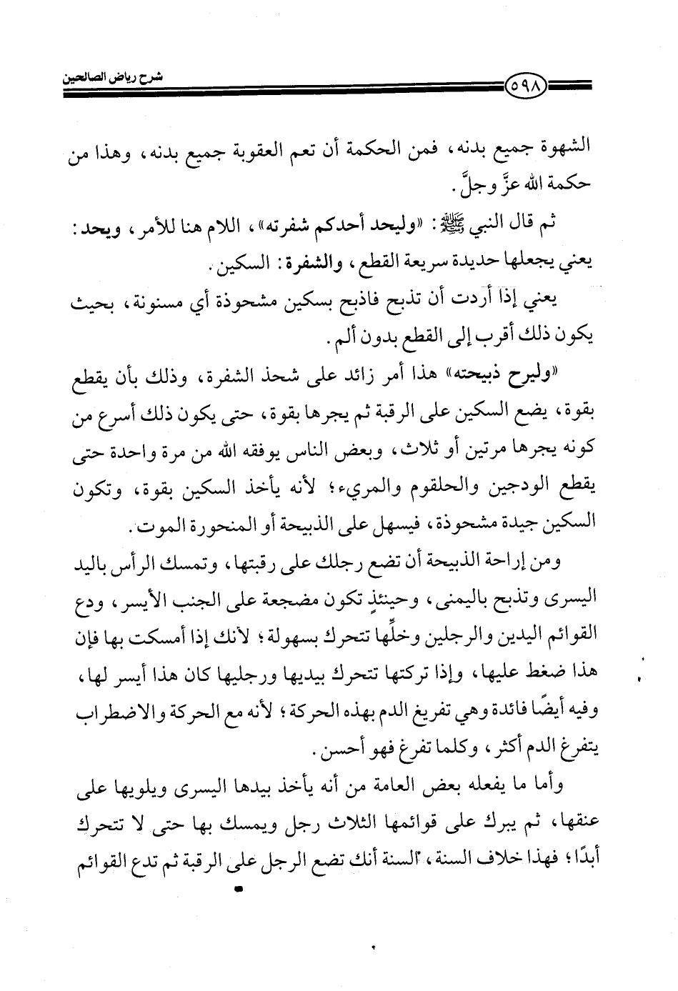 ((وليرح ذبيحته)) هذا أمر زائد على شحذ الشفرة، وذلك بأن يقطع بقوة، يضع السكين على الرقبة ثم يجرها بقوة، حتى يكون ذلك أسرع من كونه يجرها مرتين أو ثلاث، وبعض الناس يوفقه الله من مرة واحدة حتى يقطع الودجين والحلقوم والمريء؛ لأنه يأخذ السكين بقوة، وتكون السكين جيدة مشحوذة، فليسهل على الذبيحة أو المنحورة الموت.