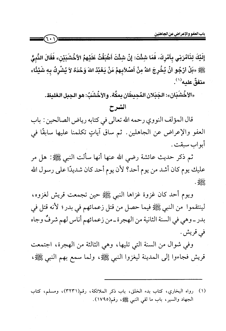EXقال المؤلف النووي رحمه الله تعالى في كتابه رياض الصالحين: باب العفو والإعراض عن الجاهلين. ثم ساق آياتٍ تكلمنا عليها سابقاً في أبواب سبقت.