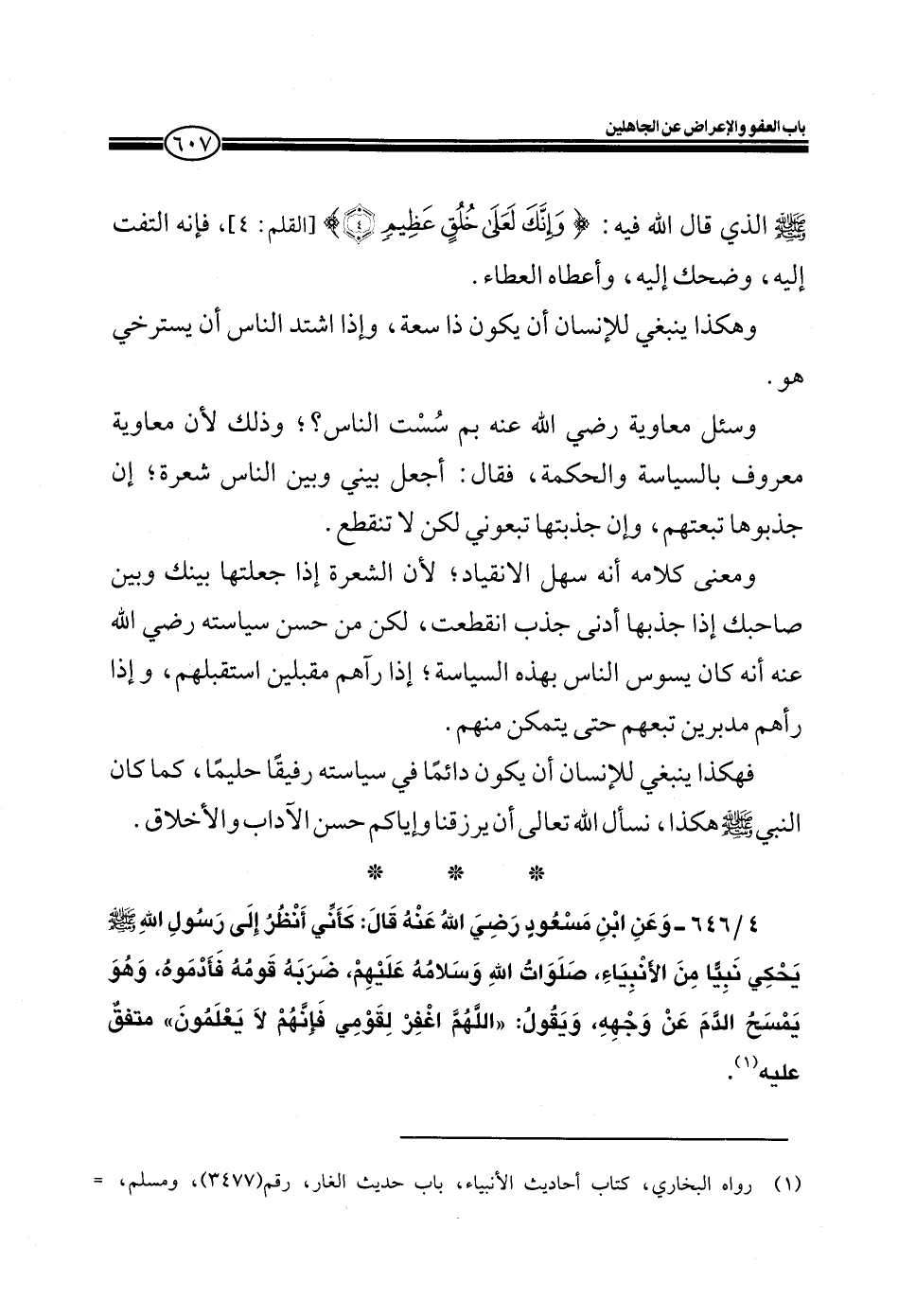 4/646- وعن ابن مسعودٍ رضي الله عنه قال: كأني أنظرُ على رسول الله صلى الله عليه وسلم يحكي نبياً من الأنبياء، صلواتُ الله وسلامهُ عليهم، ضربهُ قومهُ فأدموهُ، وهو يمسحُ الدمَ عن وجههِ، ويقولُ: ((اللهمَّ اغفر لقومي فإنهم لا يعلمُون)) متفق عليه.