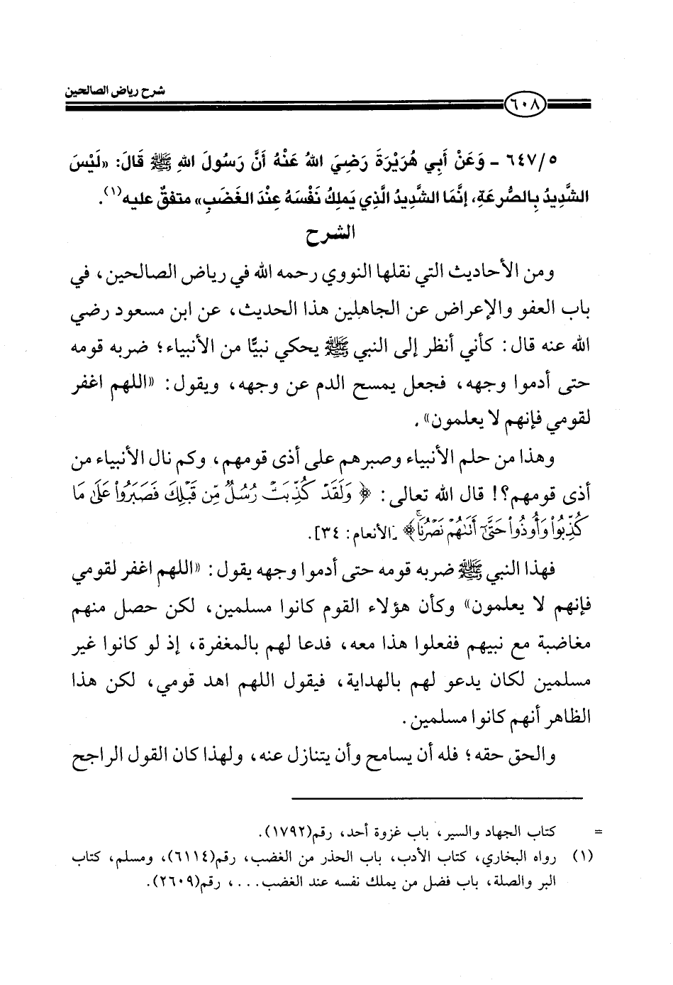 5/647- وعن أبي هُريرة رضي الله عنهُ أن رسول الله صلى الله عليه وسلم قال: ((ليس الشديد بالصرعة، إنما الشديدُ الذي يملكُ نفسهُ عند الغضب)) متفقٌ عليه.