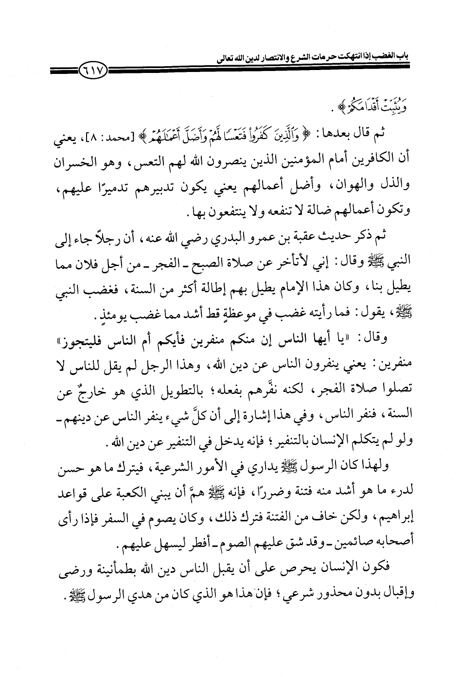 ثم ذكر حديث عقبة بن عمرو البدري رضي الله عنه، أن رجلاً جاء إلى النبي صلى الله عليه وسلم قال: إني لأتأخر عن صلاة الصبح- الفجر- من أجل فلان مما يطيل بنا، وكان هذا الإمام يطيل بهم إطالة أكثر من السنة، فغضب النبي صلى الله عليه وسلم يقول: فما رأيته غضب في موعظةٍ قط أشد مما غضب يومئذٍ.