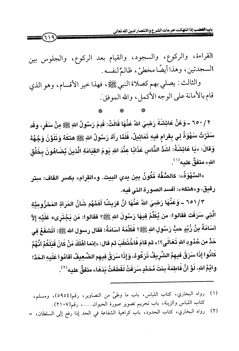 3/651- وعنها رضي الله عنها أن قريشاً أهمهم شأنُ المرأة المخزومية التي سرقت فقالوا: من يكلم فيها رسول الله صلى الله عليه وسلم؟ فقالوا: من يجترئ عليه إلا أسامةُ بن زيد حب رسول الله صلى الله عليه وسلم؟ فكلمه أسامةُ؛ فقال رسول الله صلى الله عليه وسلم: أتشفع في حد من حُدودِ الله تعالى؟! " ثم قام فاختطب ثم قال: ((إنما أهلك من كان قبلكم أنهم كانوا إذا سرق فيهمُ الشريف تركوهُ، وإذا سرق فيهم الضعيف أقاموا عليه الحد! وايم الله، لو أن فاطمة بنت مُحمدٍ سرقت لقطعتُ يدها)) متفقٌ عليه.